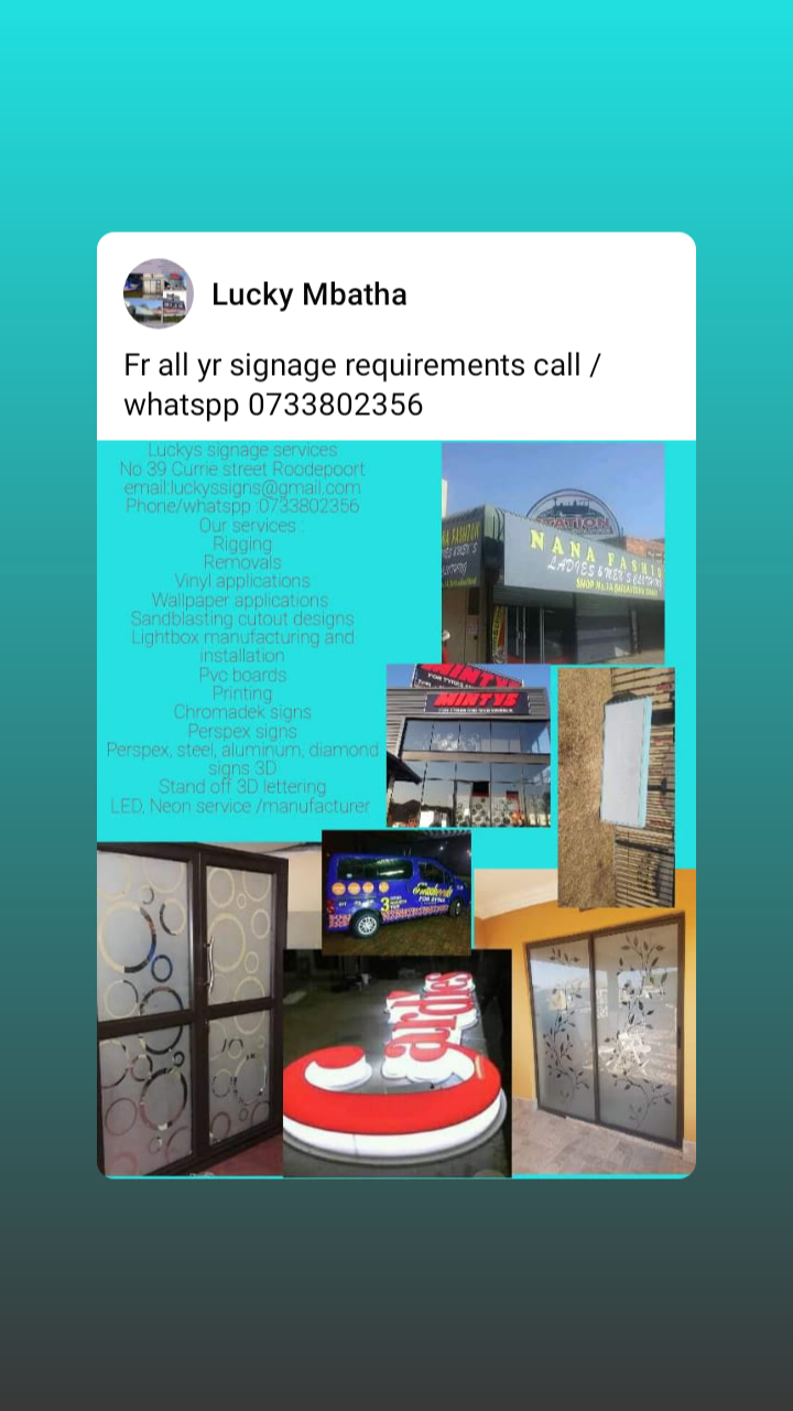 We provide all signage services from manufacturing to installations, removals, our services include rigging, vinyl applications, fullwraps, lightbox manufacturing and installation, chromadek boards manufacturing and installation, sandblasting, tinting, painting, wallpaper applications, parking signs, billboards, pvc stretching on frames, call or whatspp 0733802356view more
