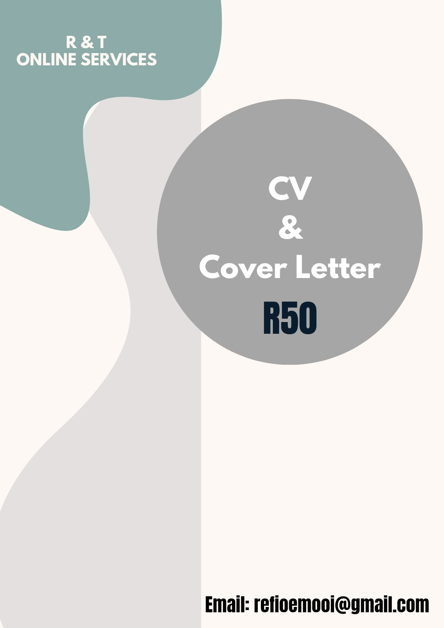 If you wish to get a proficient CV accompanied by an expressive cover letter, then R & T Online Services is your go to service provider. We will tailor make a CV befitting for your application and a cover letter that will entice whomever reads it, all for R50 and delivered within 4 hours.