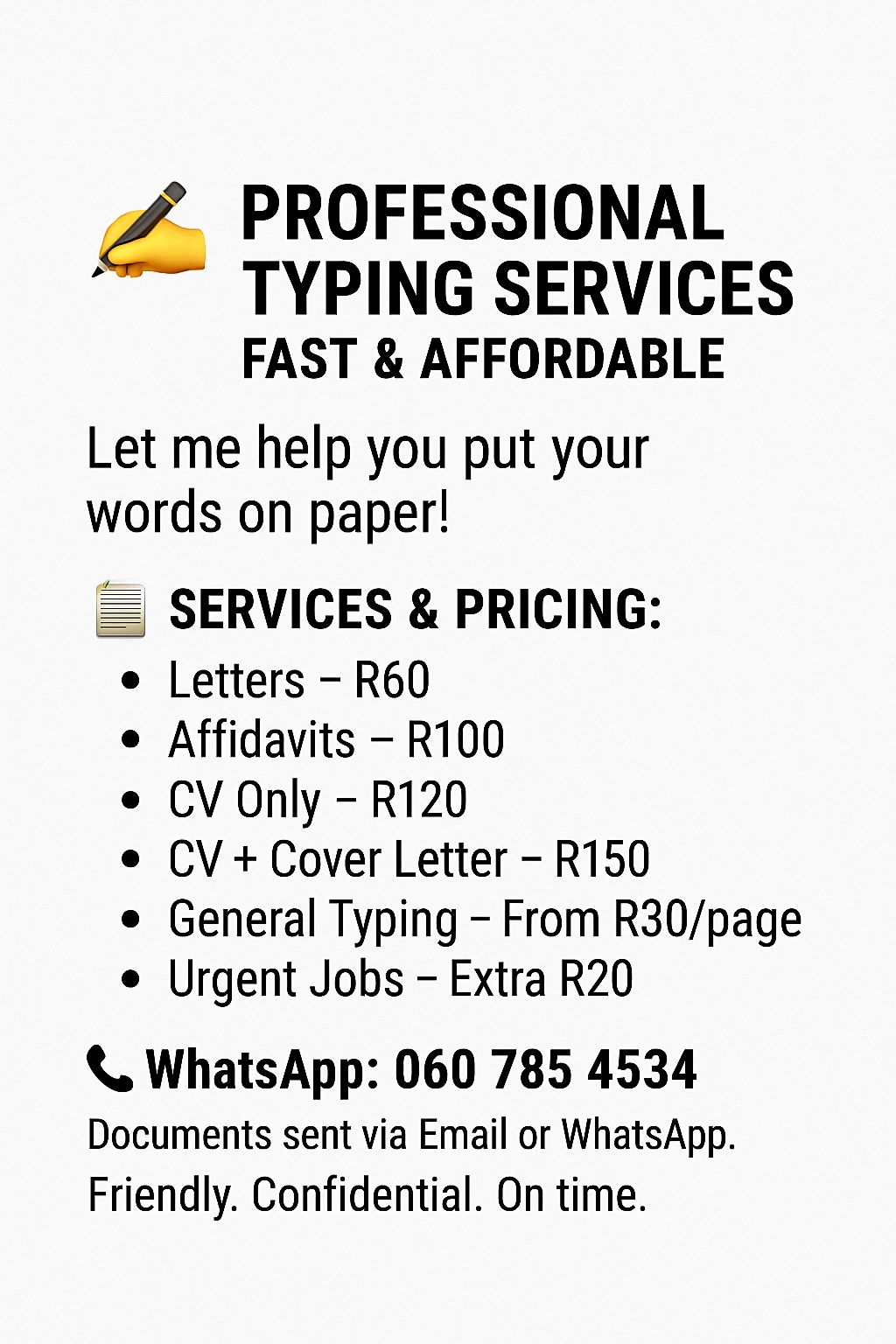 Rendering typing service. More details:Intention - Contact MeRegion - GautengCity - Vanderbijlpark