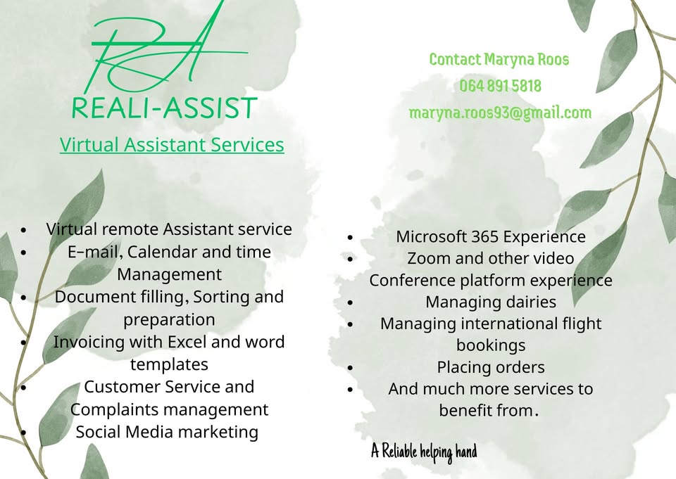 Check business Card or contact me for details Maryna 064 891 5818view more (Whatsapp) or Email maryna.roos93@gmail.comview email....
