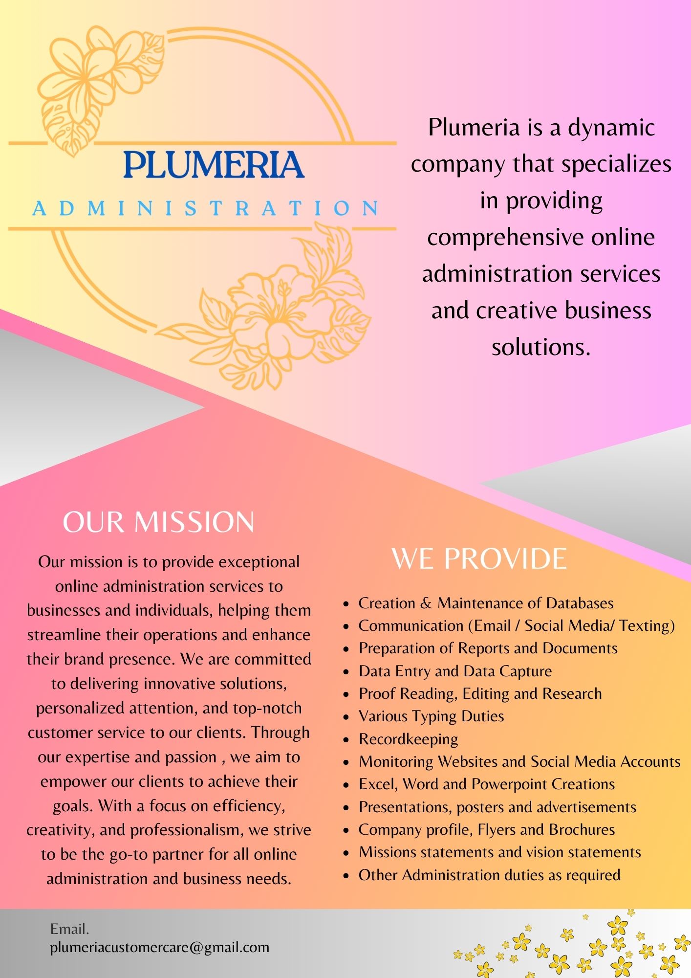 Don't let administrative tasks hold you back from achieving your business goals. Partner with Plumeria Administration today and experience the convenience of online administration services. Contact us now at plumeriacustomercare@gmail.comview email... to discuss how we can support your business!