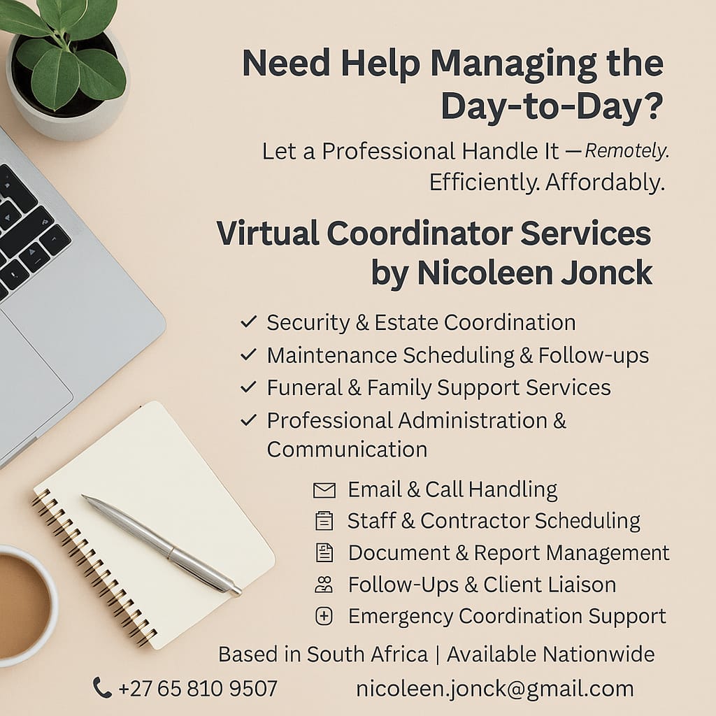 Hi, I’m Nicoleen Jonck, and I offer virtual coordinator services for busy business owners and estate managers who need reliable, remote support without the cost of a full-time hire. I have years of hands-on experience in security, maintenance, administration, and family support, and I specialize in making sure everything runs smoothly — from scheduling and reporting to client follow-ups and emergency coordination. If you're looking for someone calm under pressure, organized, and easy to work with — I’d love to chat and see how I can help you lighten your load.