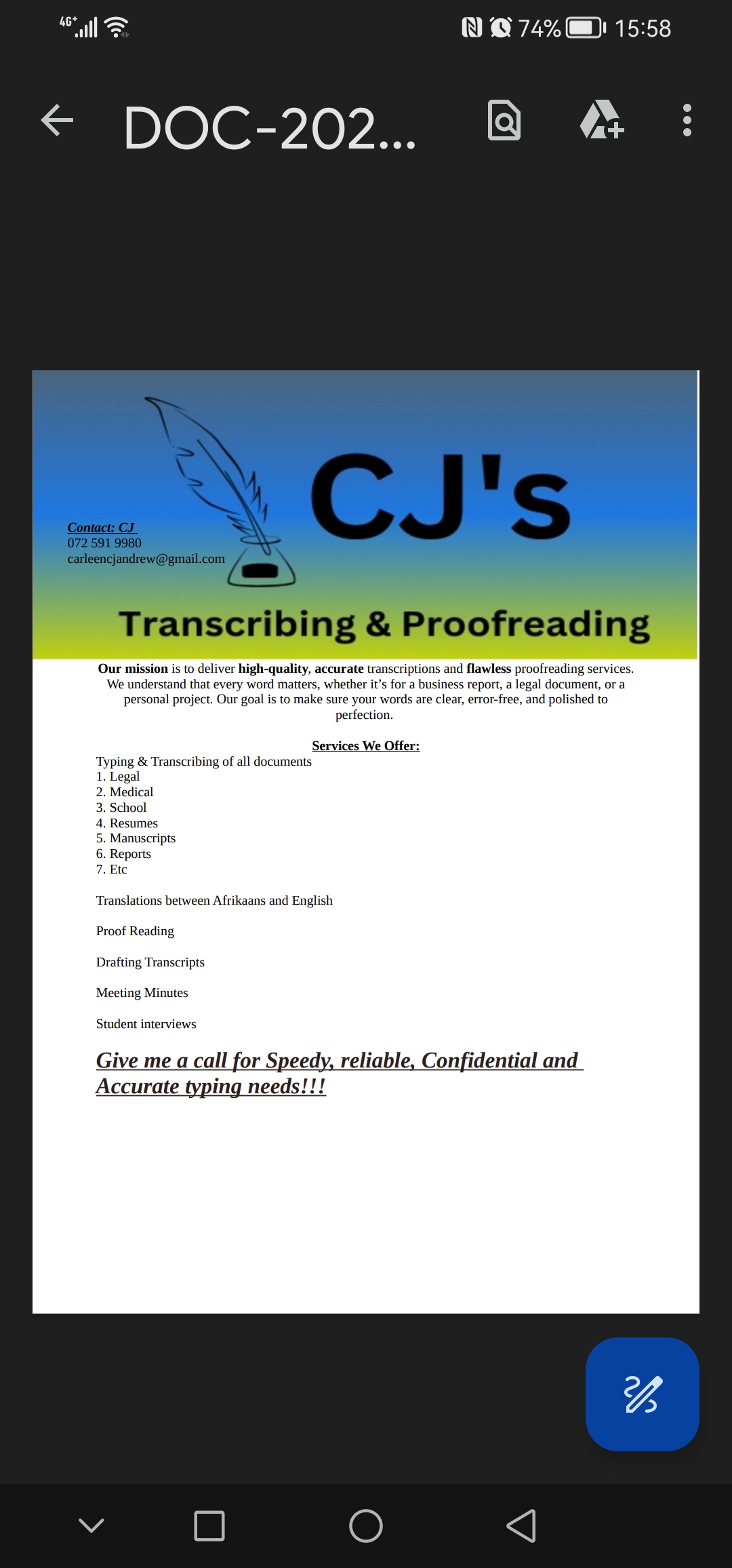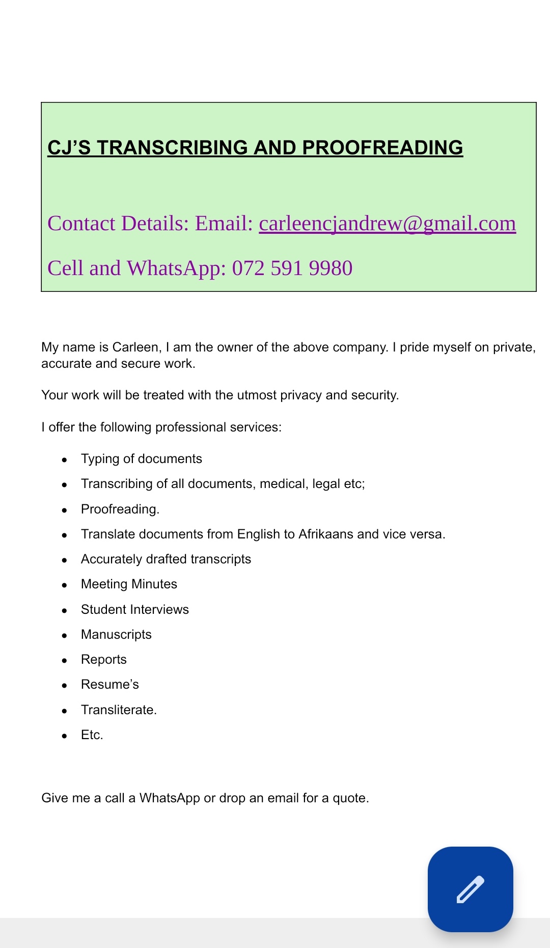 I work from home. Have a secure environment to transcribe or proofread all your documents in privacy and keep it safe. Reverence available.