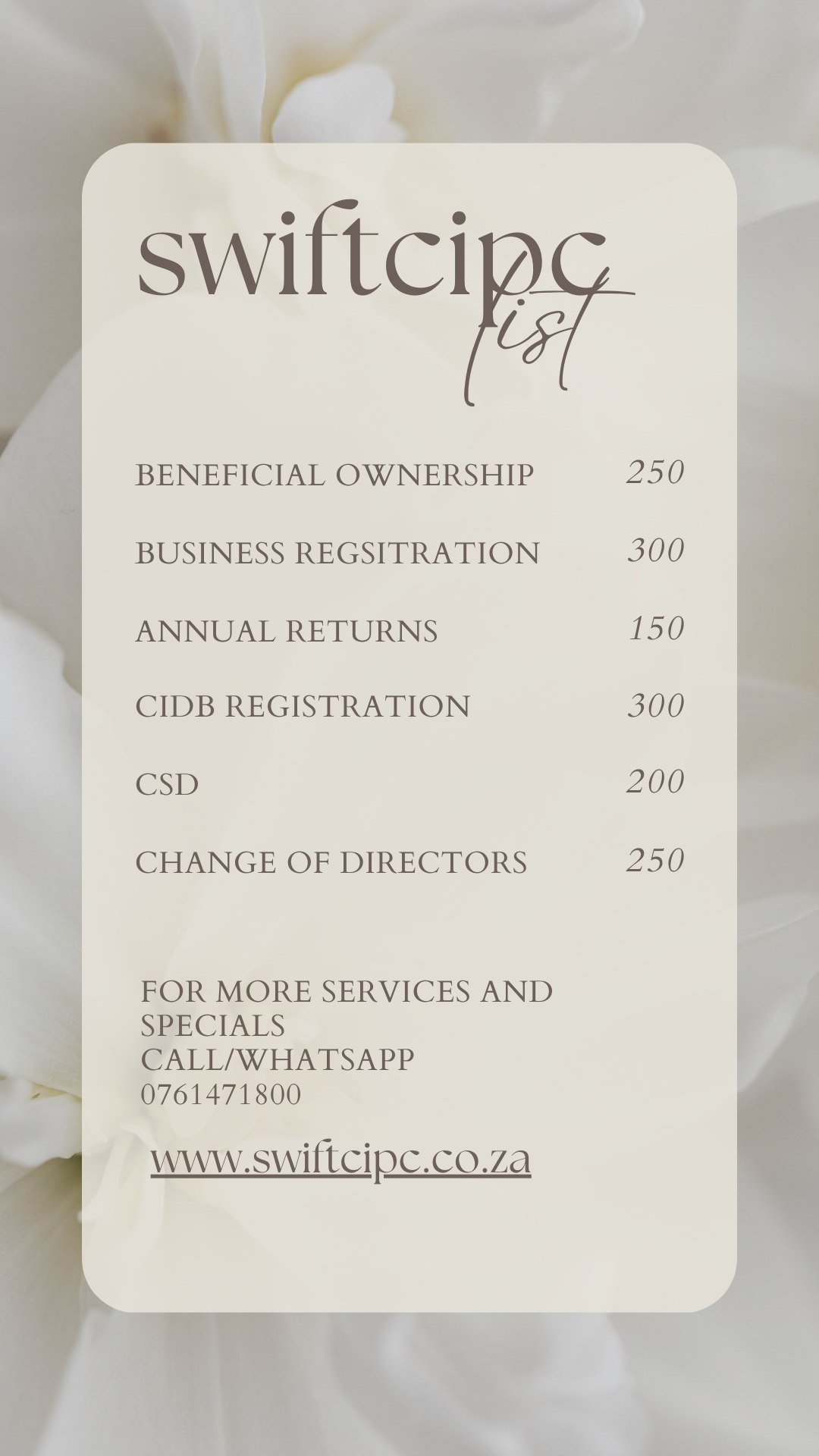 Need quick and hassle-free business registration? Look no further! At Swift CIPC, we specialize in company registrations, reinstatements, and beneficial ownership certificates at the lowest prices in South Africa.