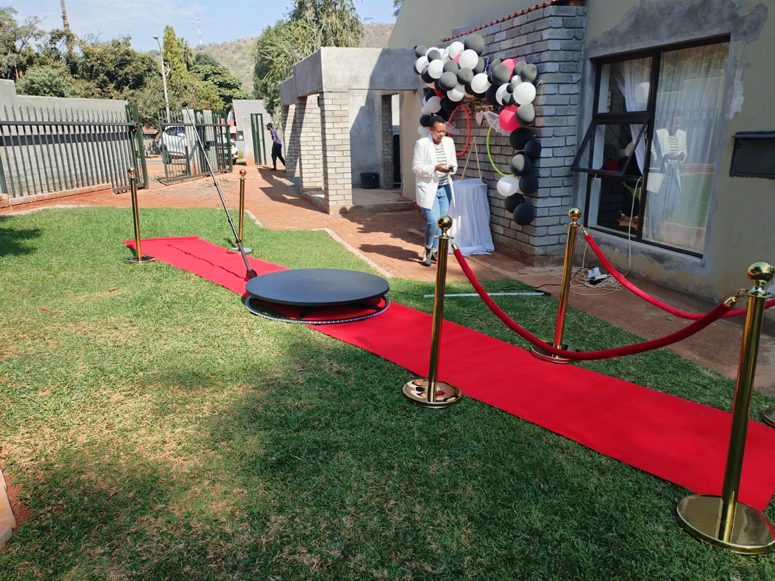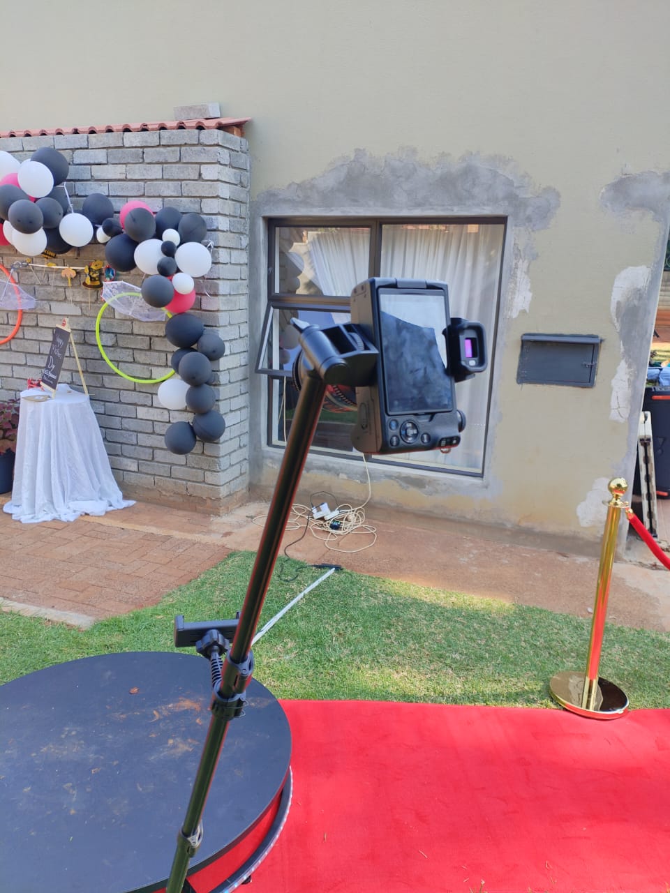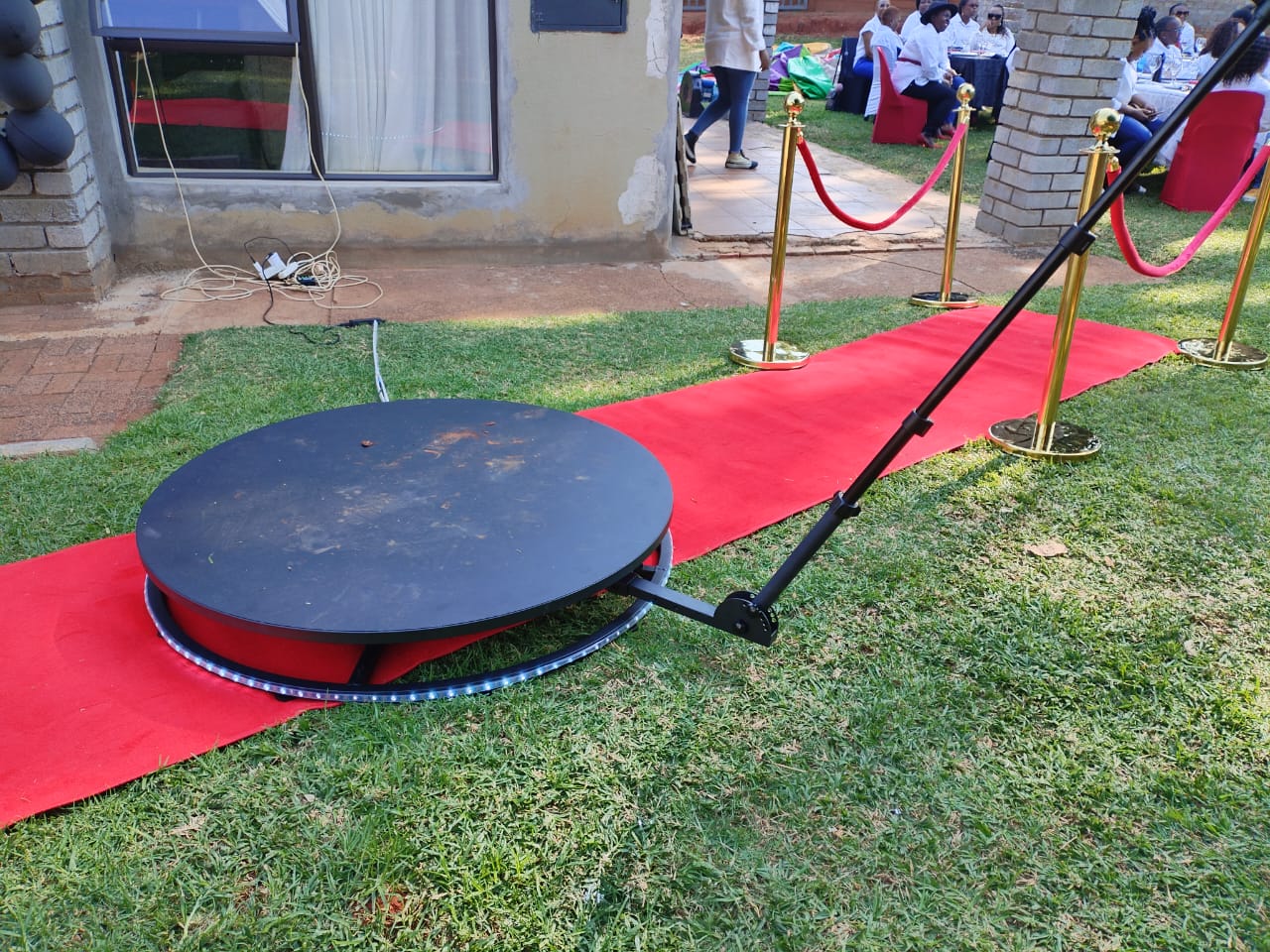 115cm 360 photo and video booth, Canon camera with lens adaptor, 2x wireless video/photo LED light kits, red carpet walkway set and booth accessories + carry case