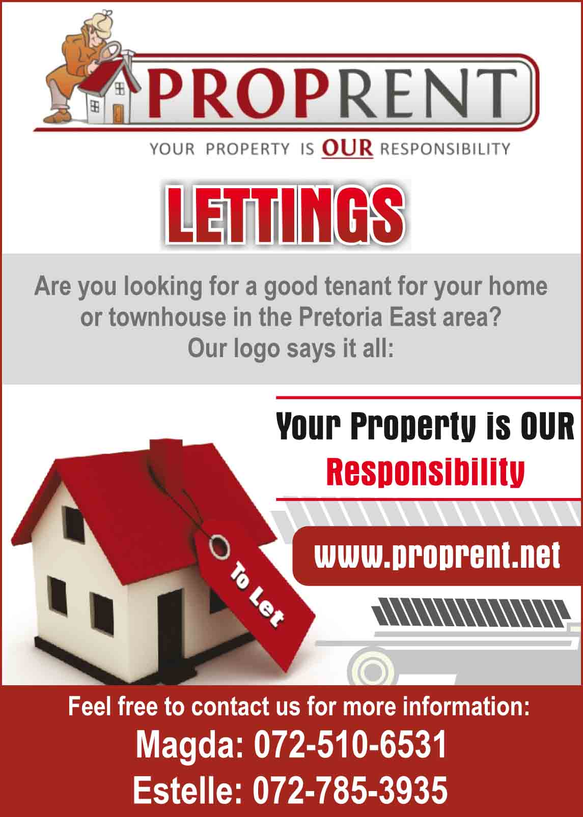 ARE YOU LOOKING FOR A GOOD TENANT FOR YOUR HOME OR TOWNHOUSE IN PRETORIA EAST? OUR LOGO SAYS IT ALL: "YOUR PROPERTY IS OUR RESPONSIBILITY" CALL US NOW