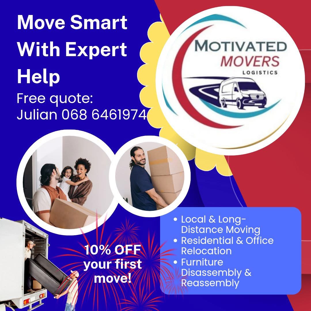 We will help you move. Send us your name, contact details, a list of furniture, and from where to where you want to move. And we will send you a free quotation. WhatsApp or Telegram 068 646 1974view more or Email motivatedmoverssa@gmail.comview email... for your free quotation.