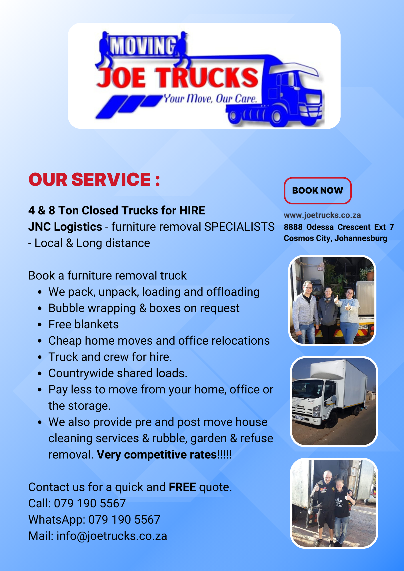 JOE TRUCKS Furniture Removals South Africa for a Free Quote