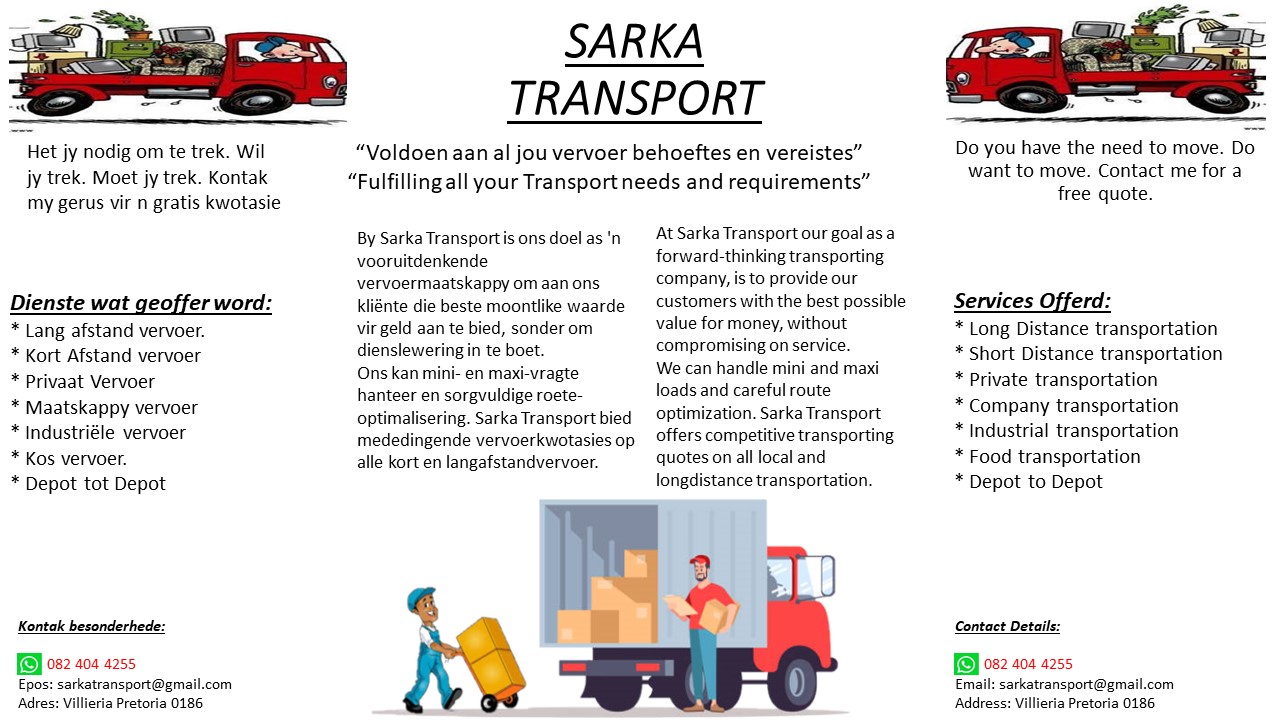 Het jy nodig om te trek. Wil jy trek. Moet jy trek. Kontak my gerus vir n gratis kwotasie. Sarka Transport ( 0824044255view more )