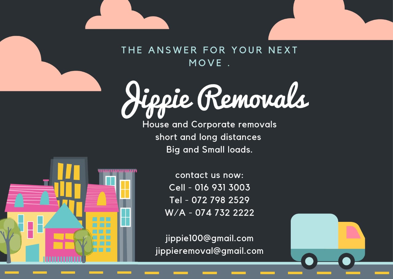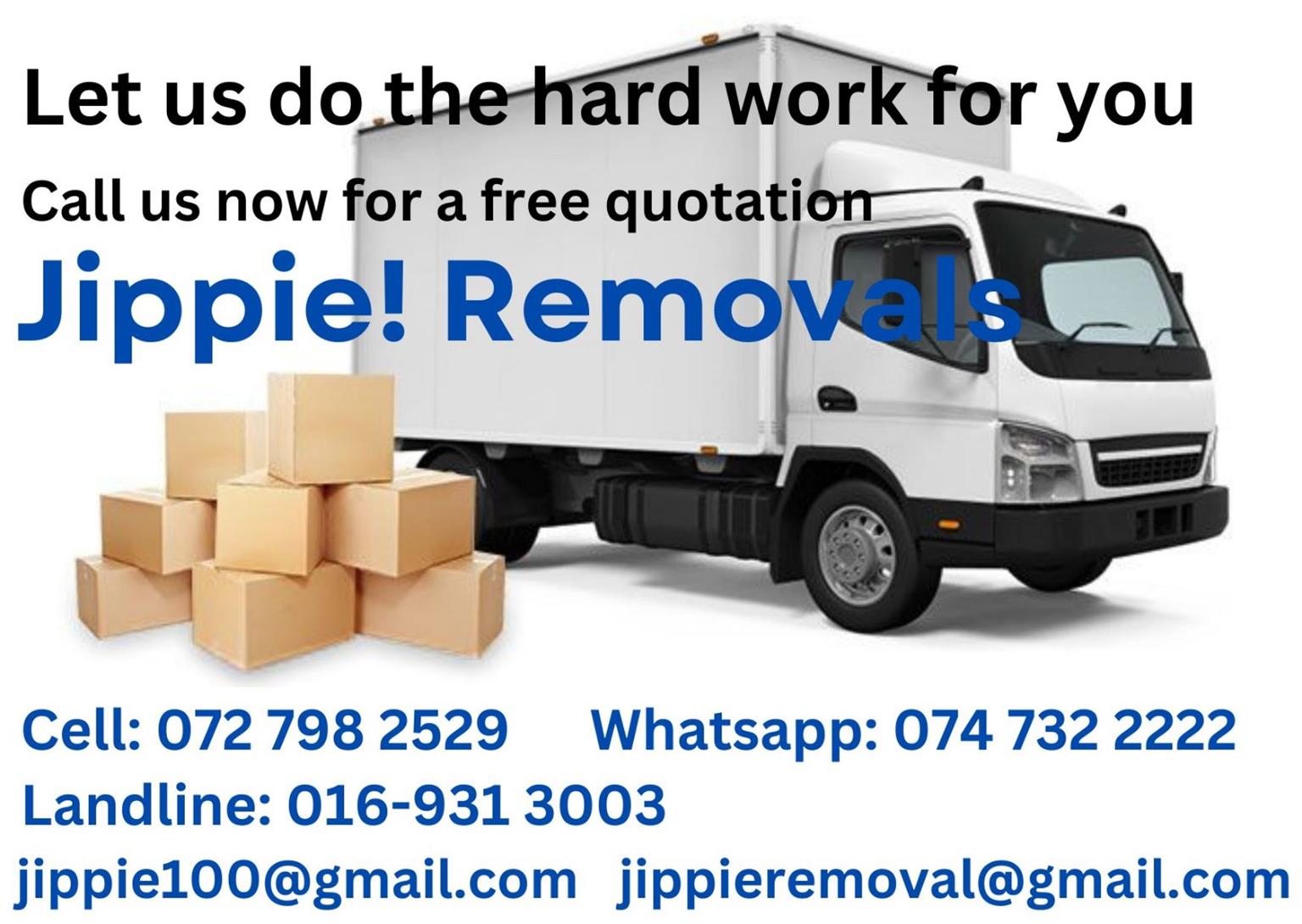 Removal specialists: Please contact 016 931 3003view more or 072 798 2529view more also on whatsapp, email- jippie100@gmail.comview email... to request a quotation. We do offer furniture removal services countrywide. Complete relocation assistance – household and business. Furnish of free detailed quotations. Support with additional quotes. Supply of boxes, cartridges and packing material. Experts in: Safeguarding and protection of furniture and glassware; Packing of boxes and caring for valuables; We do manage secrets of non damaging; Maneuvering furniture and precious assets through narrow passages and doors. Professional, high quality, skilled and reliable service. Safe storage facilities.