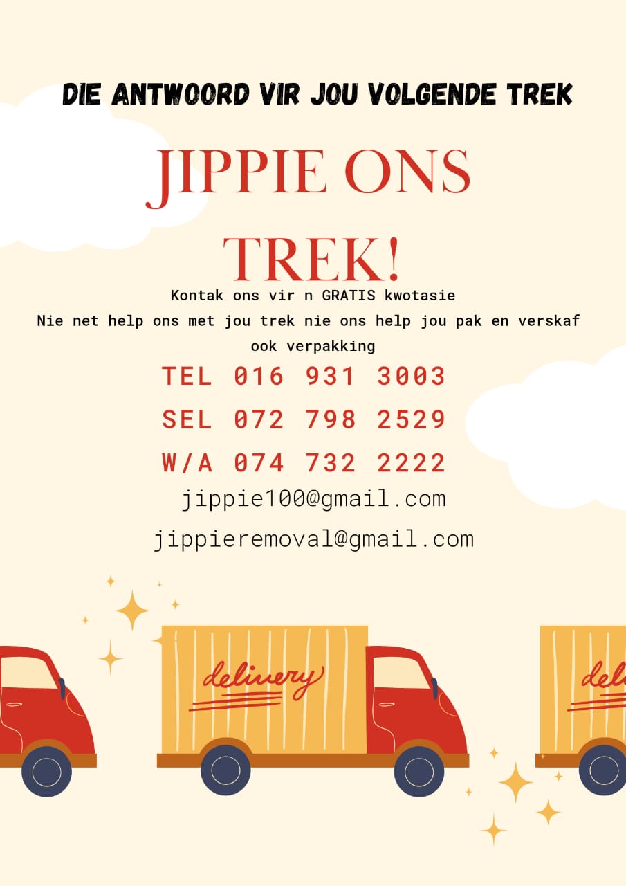 Affordable prices giving value for money. Shared removals and return removals included, if available. Give us the ball, send an e-mail to jippie100@gmail.comview email.... We deliver, you score without stressing.. Trustworthy, reliable and utmost caring in packing, transport and storage. The best for the least. Web: www. jippieremoval.co.za
