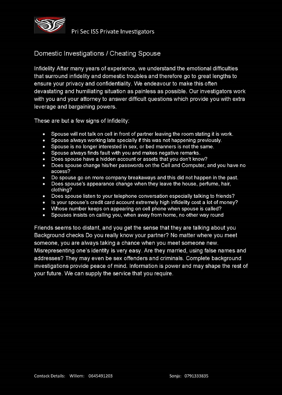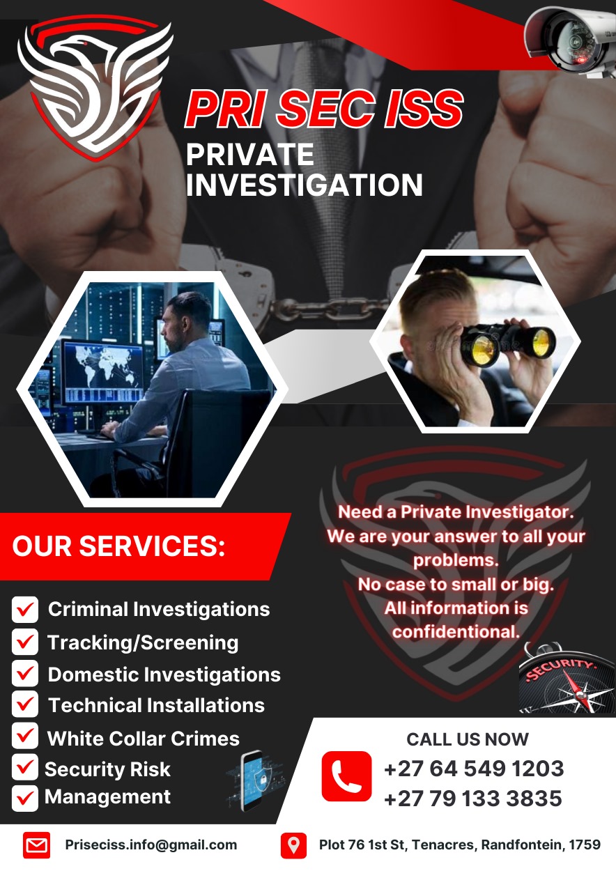 Pri Sec Iss Conducted Private Investigation. Criminal, Domestic, Fraud, Stock Theft, Missing persons, Tracking and Tracing, etc. We are there to provide you with the best advice to take the right decision in your case and to walk the route with you.