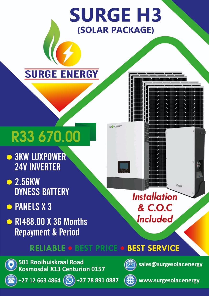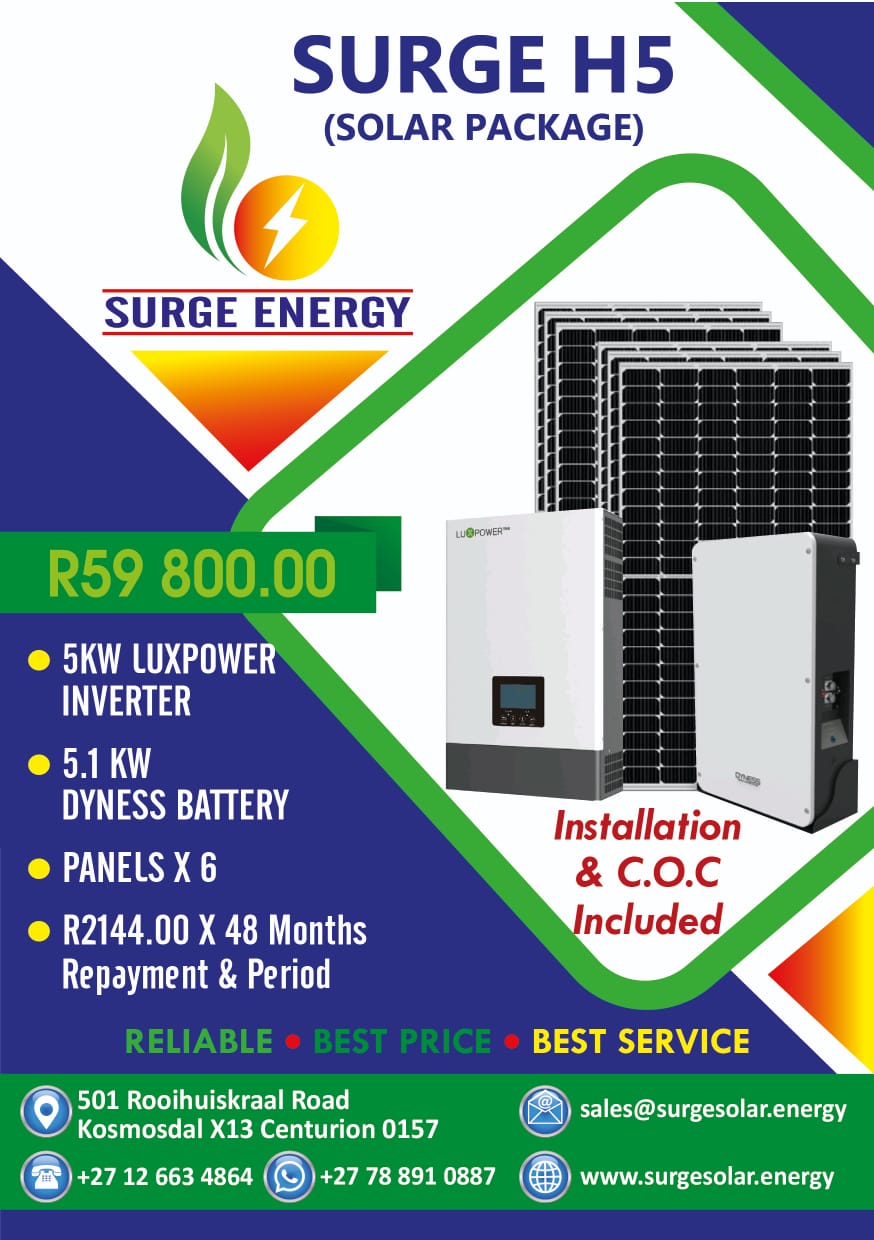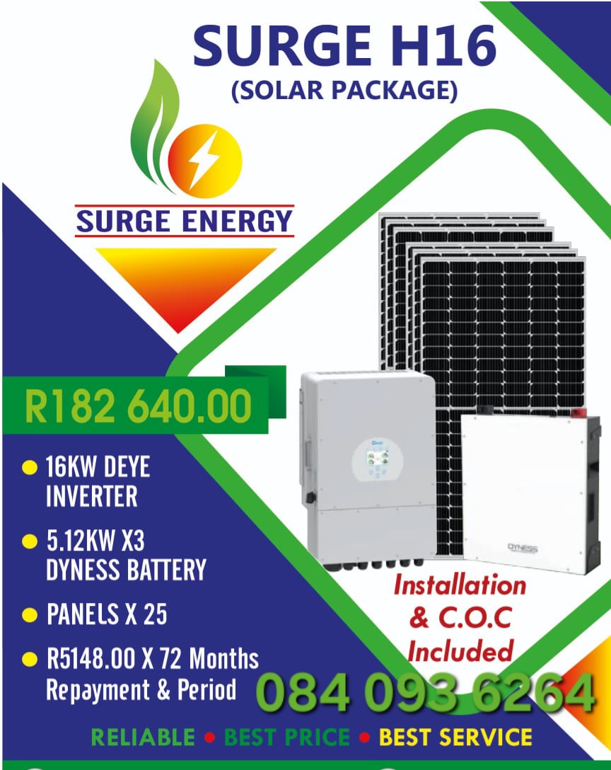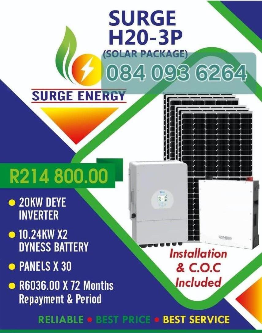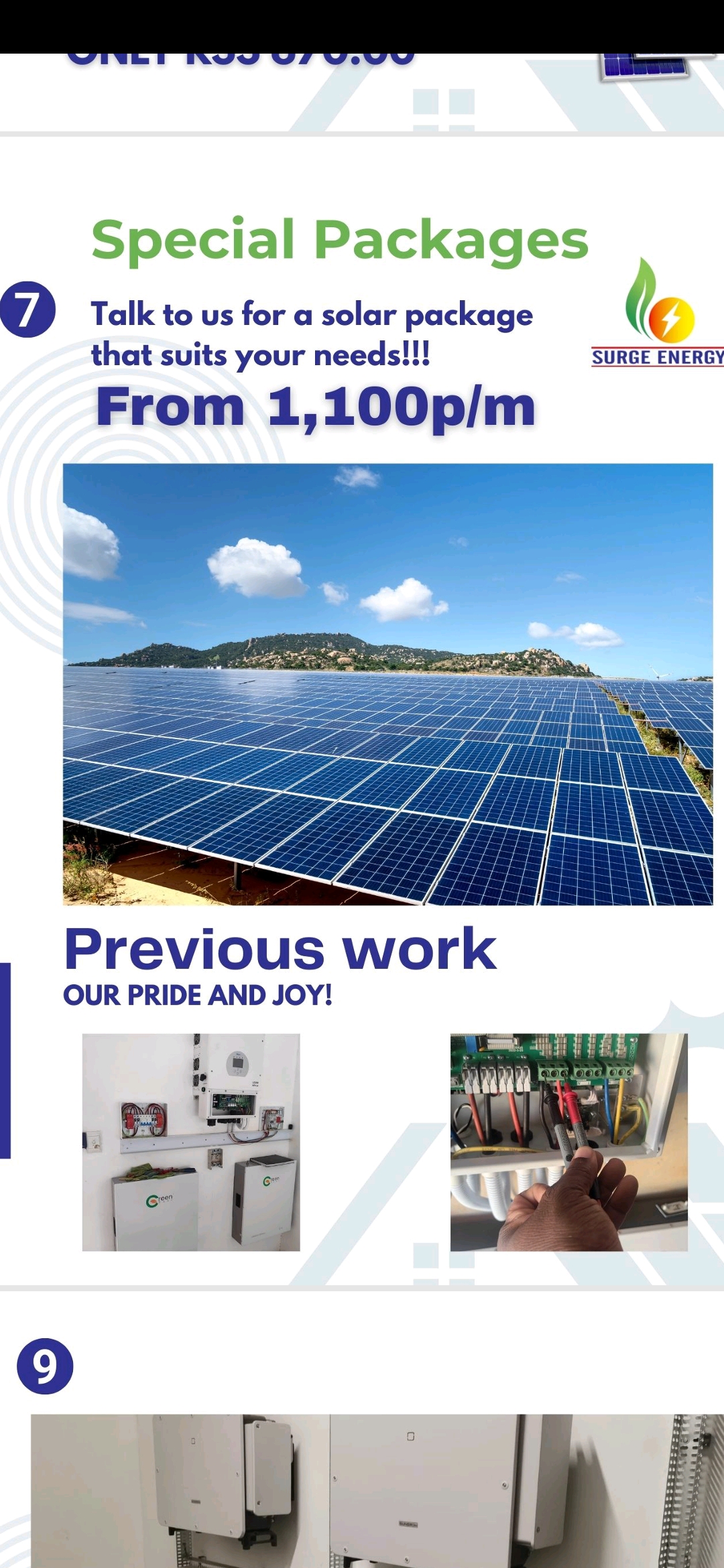 We are supplying high quality brand new solar panels, batteries, Inverters and accessories at a discount price and this comes with installation and coc. Rent to buy offer and or cash option. 3 months to 72 months to pay. Several sizes and packages to choose from. We also doing maintenance and repair. Our team of professional and qualified technicians is ready to assist. Contact us for a quotation at 0 cost.