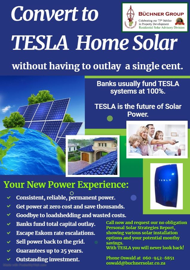 Call Oswald Buchner (Chartered Accountant) to request a no obligation Personal Solar Strategies Report, showing various solar installations options and your potential monthly savings. With TESLA you will never look back! [hidden information] or [hidden information]
