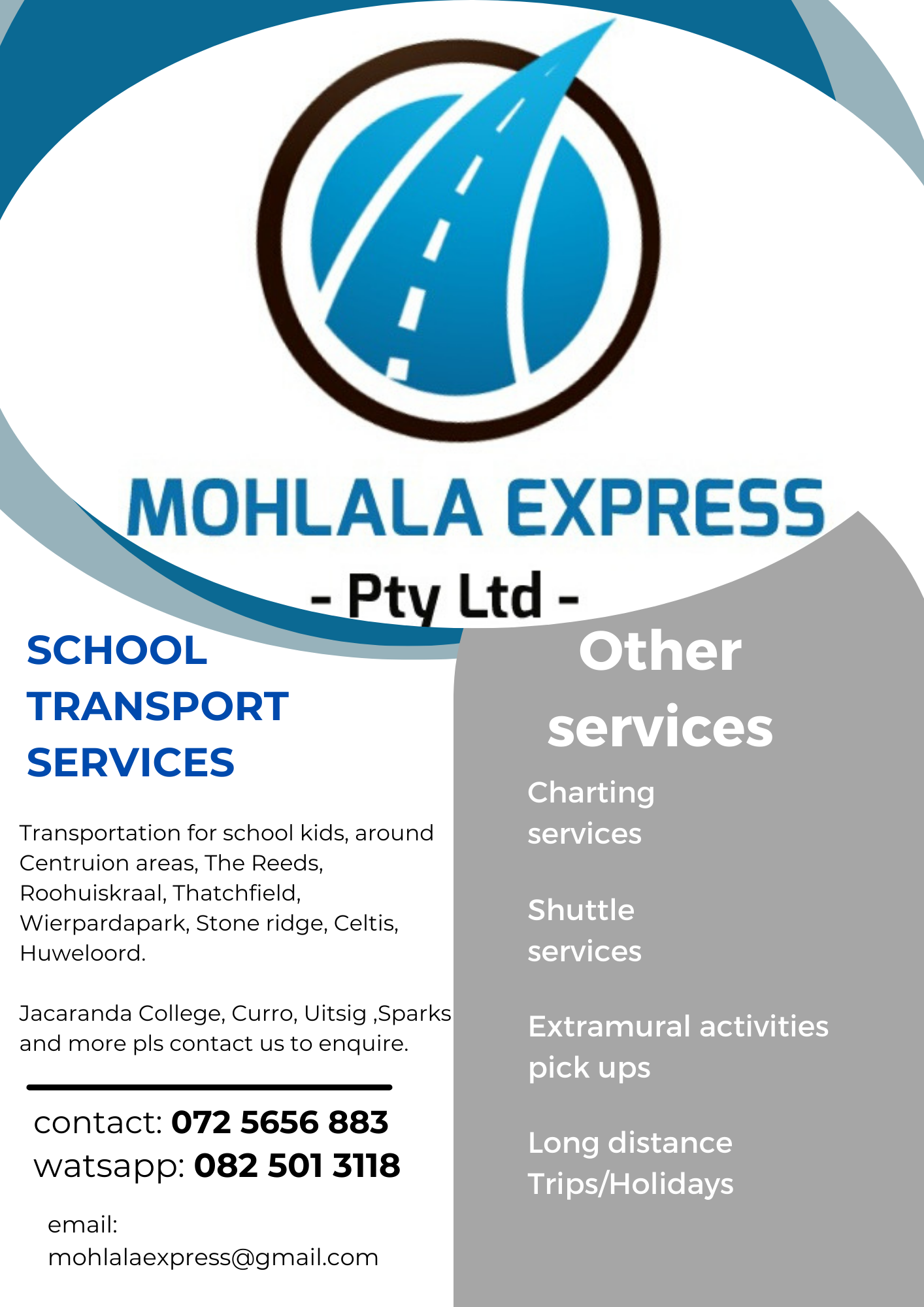 Local trips less than 5 Km are R1000 to school and back, From house to school and back around areas mentioned R1700, siblings (R100 off return trip)