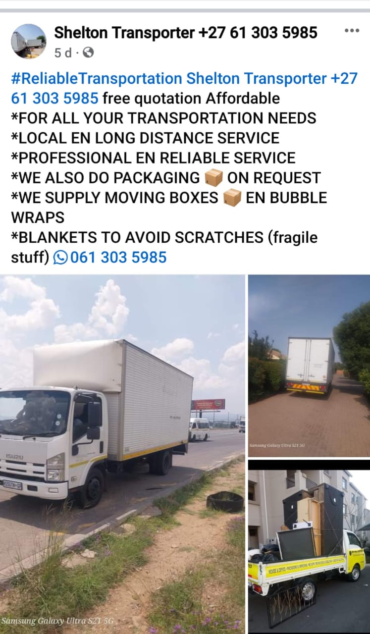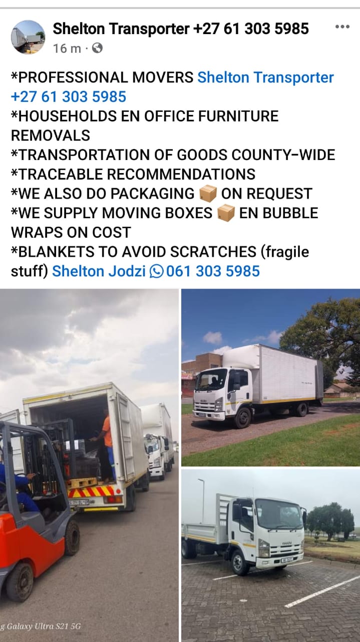 *MOVING IN / OUT * HOUSEHOLDS EN OFFICE FURNITURE *TRANSPORTATION OF GOODS NATIONWIDE *PROFESSIONAL EN RELIABLE SERVICE *WE ALSO DO PACKAGING 📦 ON REQUEST *WE SUPPLY MOVING BOXES 📦 EN BUBBLE WRAPS *BLANKETS TO AVOID SCRATCHES (Fragile stuff) Affordable Rates +27 61 303 5985view more 📞 📲*