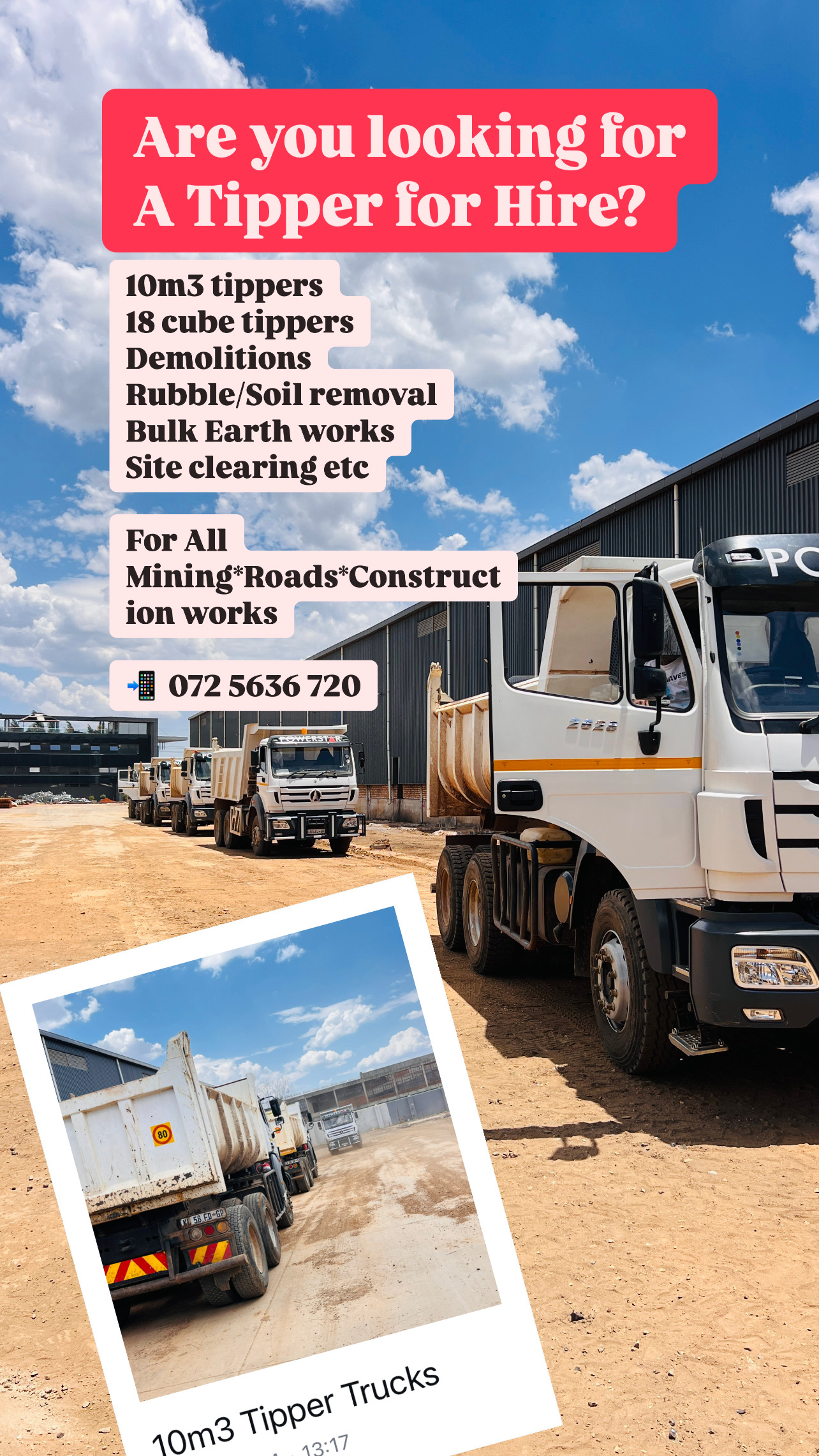 Tippers for hire in MidrandRubble removal Demolition Daily weekly and monthly Call 0725636720view more