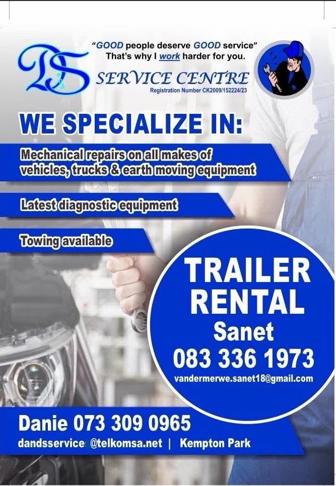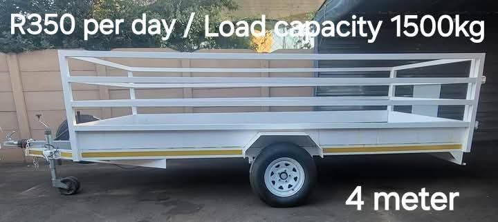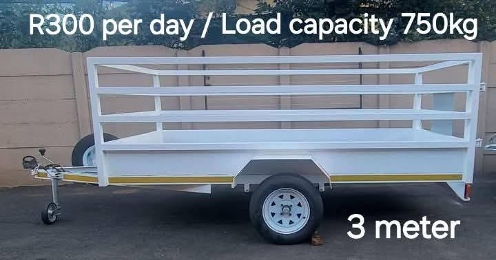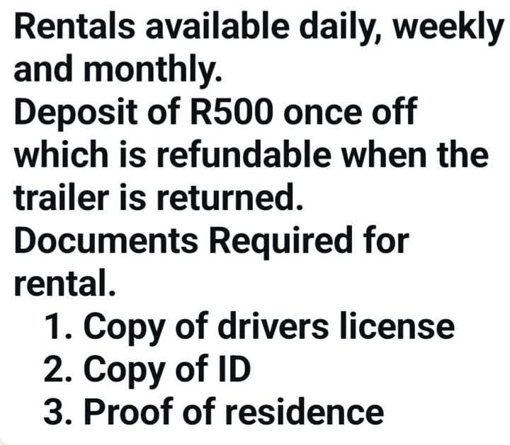 Trailer rental in Cresslawn Kempton Park. 3m x 1.6 and 4m x 1.8. Daily, weekly or monthly. Starting R350 with R500 deposit, Collect and return only by renter. T&C will apply. Valid Drivers license and proof of residence.