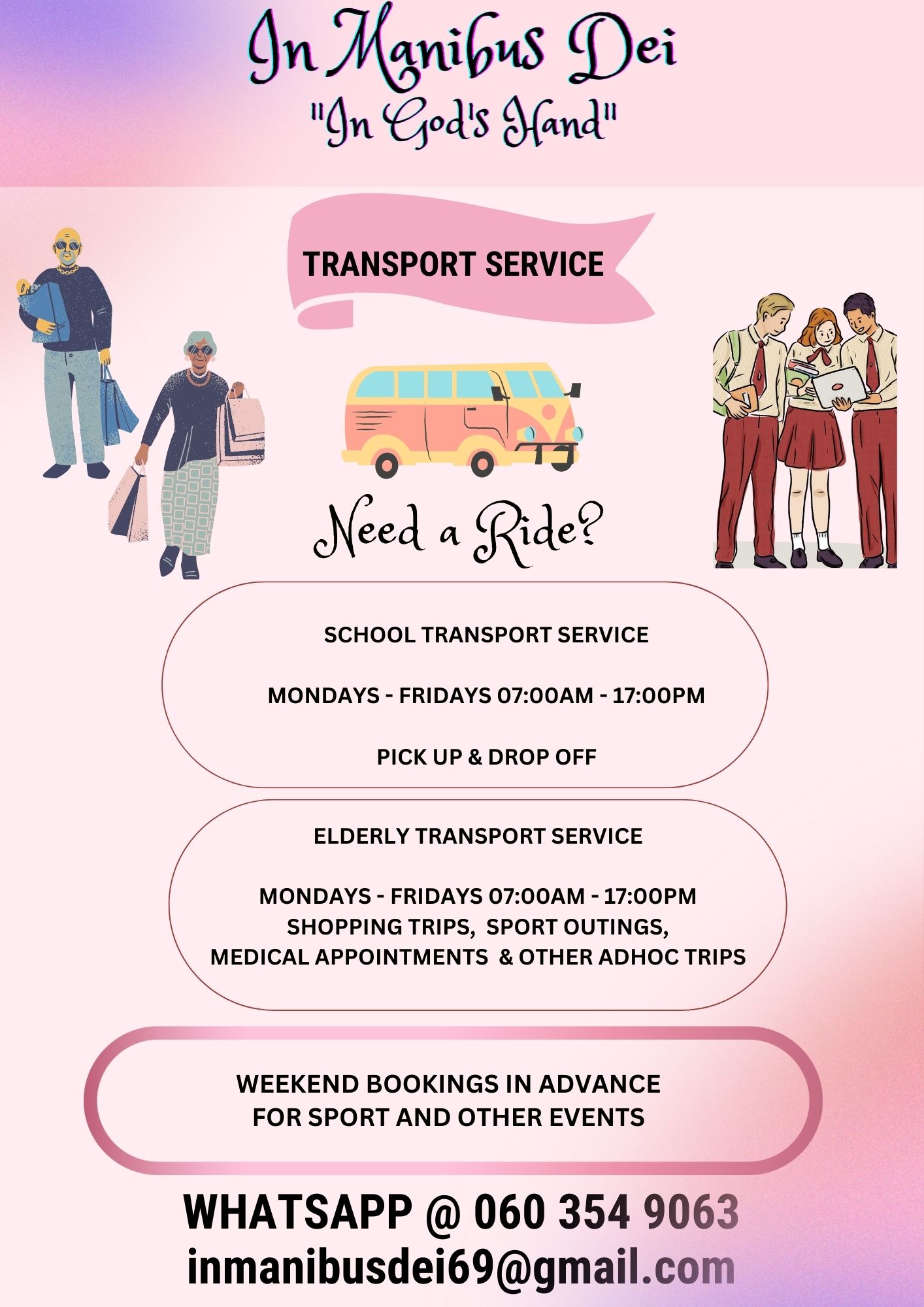 School and Elderly Transport (OR Tambo Drop off and Pick up Services for 3 persons per time)