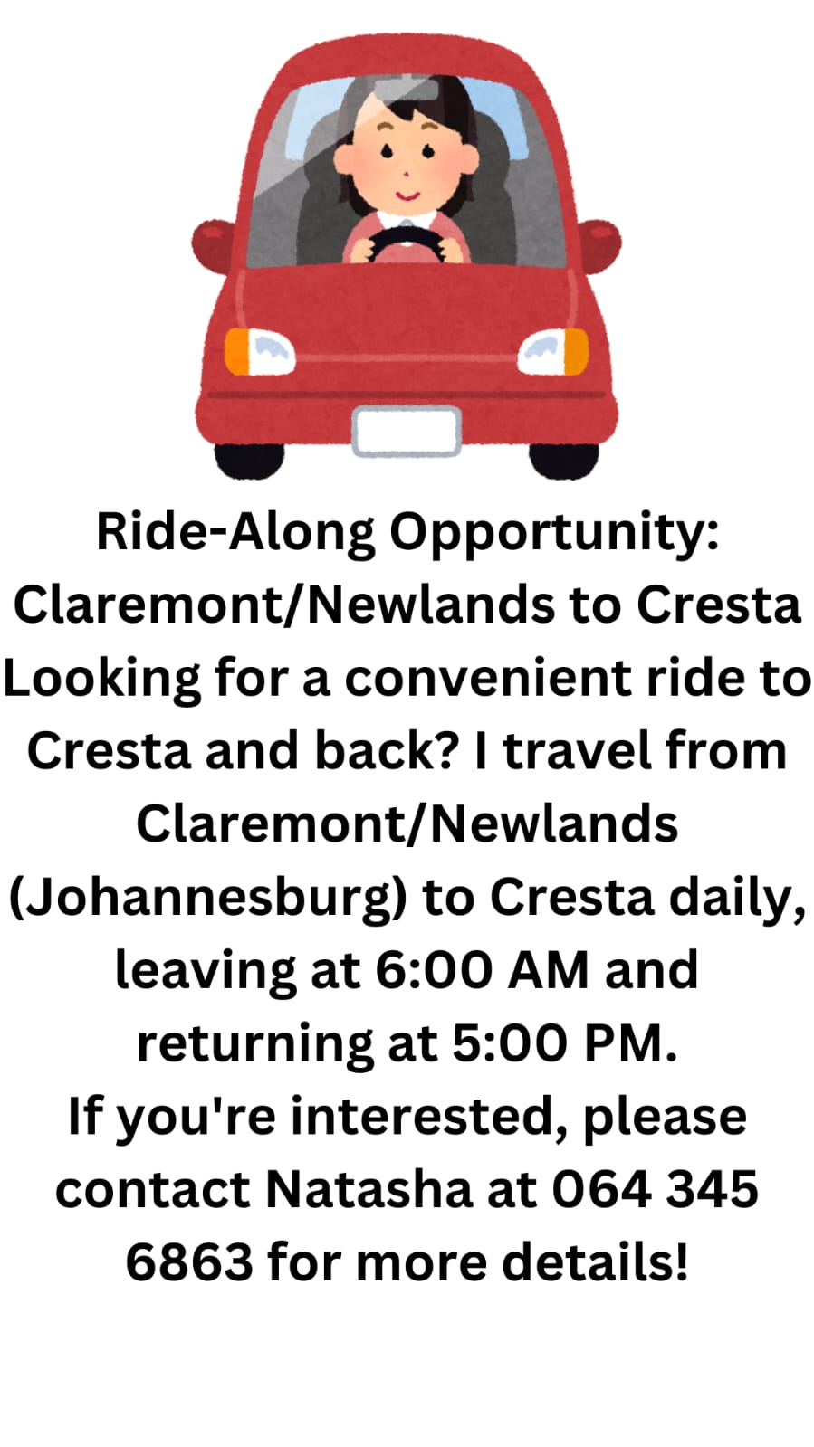 Looking for a convenient ride to Cresta and back? I travel from Claremont/Newlands (Johannesburg) to Cresta daily, leaving at 6:00 AM and returning at 5:00 PM.