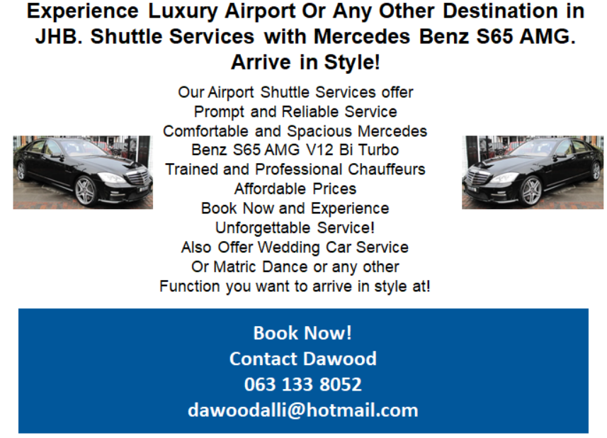 Shuttle Service Available for Corporate Events, Boys and Girls Night out, Airport Drop off or Collection, Matric Dance or any other function you want to arrive in style at! No self drive, Driver provided, from R2500 to R4500 in an around Jhb, longer trips can be quoted for separately