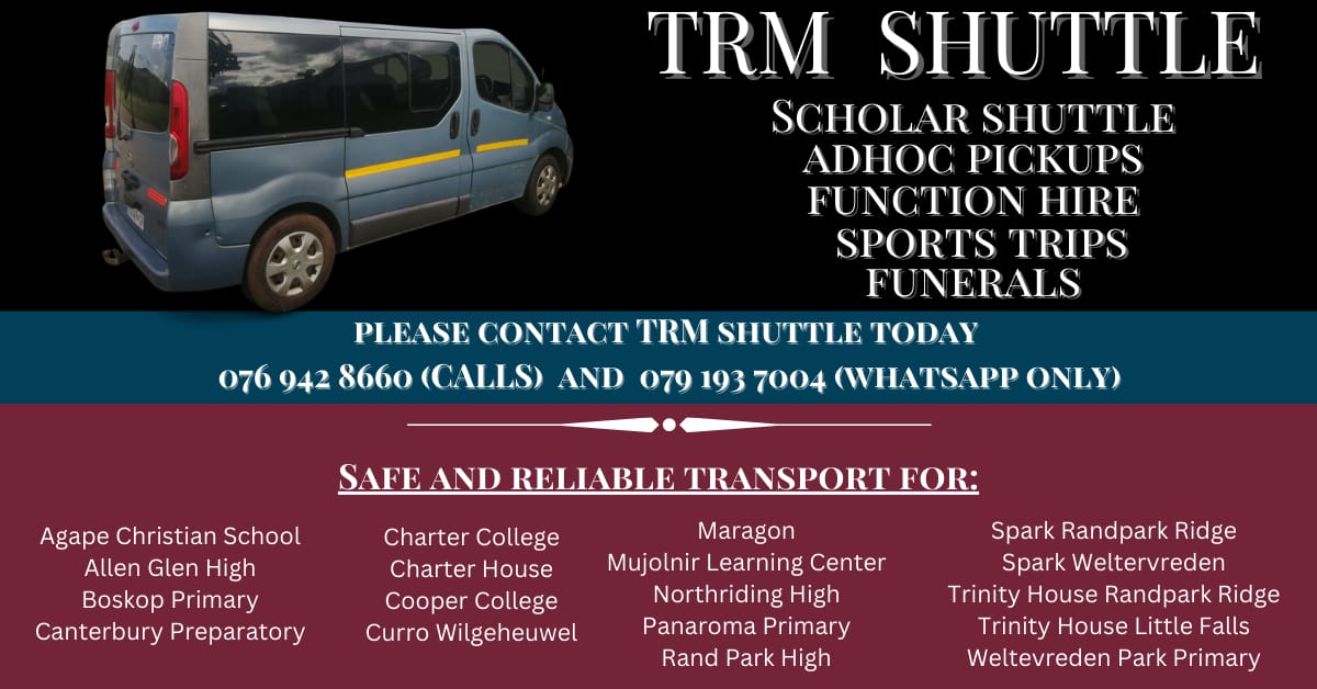 Scholar transport services available in and around Rumisig, Wilgeheuwel, Strubens Valley, Little Falls, Radiokop, Randpark Ridge, Weltervreden Park and surrounding areas. We cover schools like Rumisig Academy, LE-AMEN, Eagle House School, Trinityhouse Little Falls and Randpark Ridge, Curro Wilgeheuwel, Allan Glen High school, Panorama Primary school, Charterhouse School, Randpark High School, Rumisig International Montessori, Crawford International Rumisig