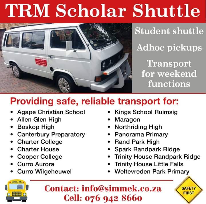 2025 Scholar transport seats available for schools in and around Rumisig, Wilgeheuwel, Weltervreden Park, Randpark Ridge, Little Falls, Radiokop, Rumisig International Montessori, Crawford International Rumisig, LE-AMEN, Tres Jolie Contact us 0769428660view more