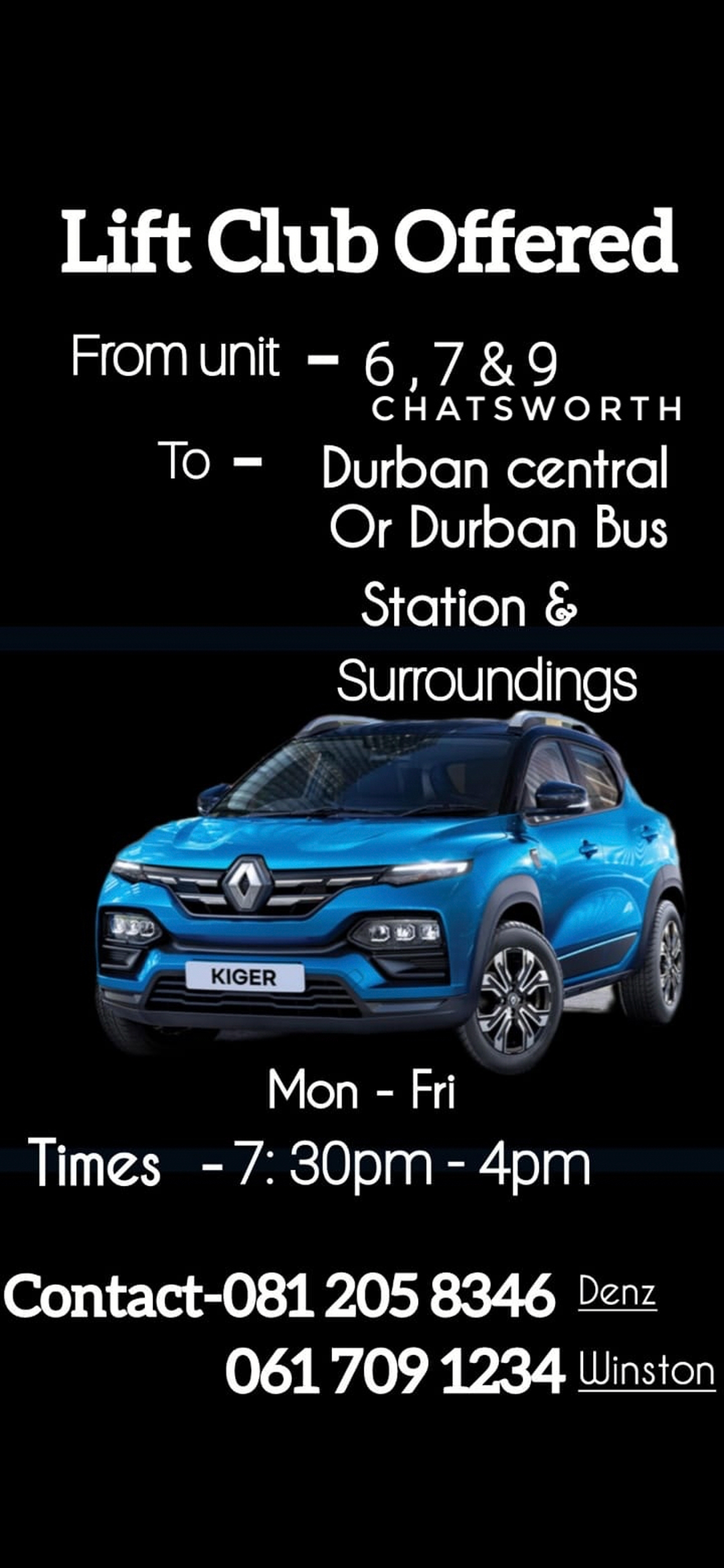 Lift club offered from chatsworth unit 6.7.9 to durban bus station or surroundin. More details: