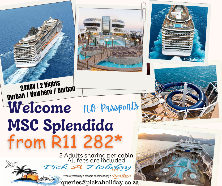No passports needed! Come and enjoy 2 nights on MSC Splendida. From R11 282 per cabin for 2 adults sharing. All mandatory fees are included.
