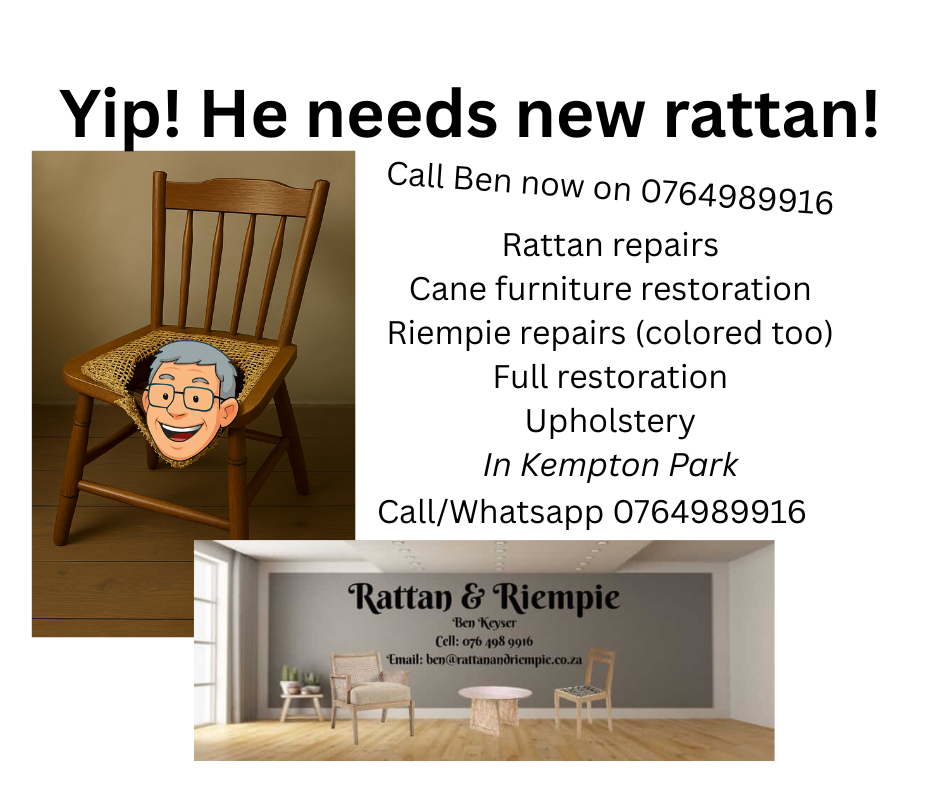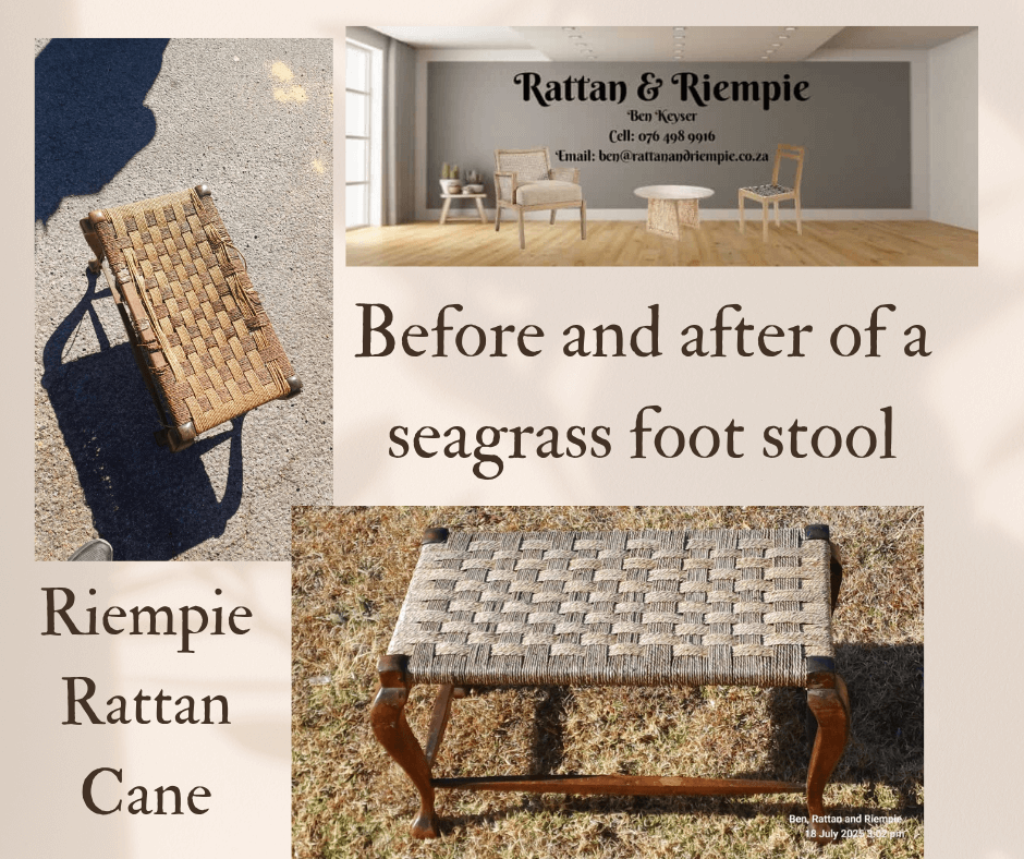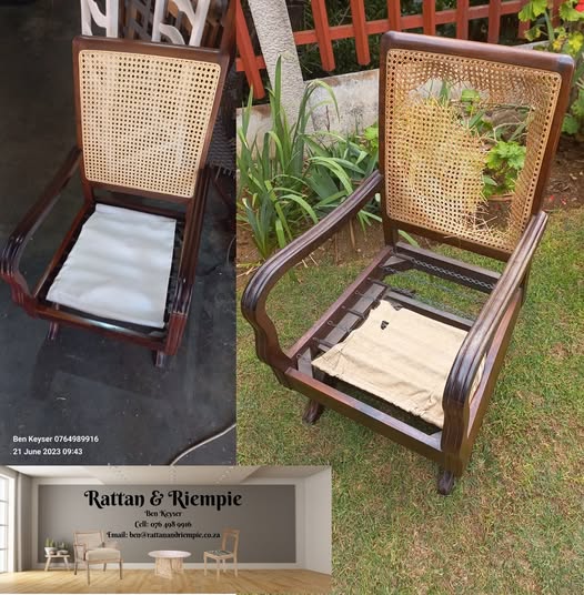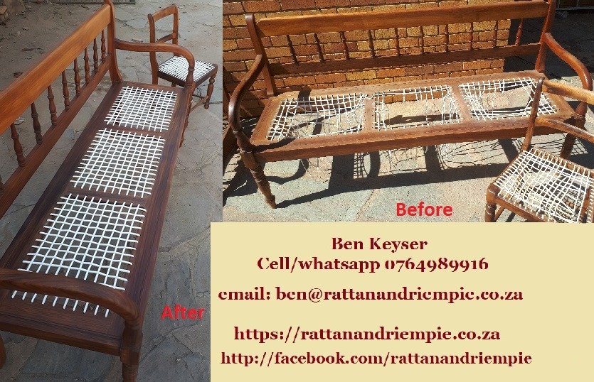 Riempies, cane furniture, Cane webbing (kitchen chairs, ball and claw lounge suites etc), wrapping (twisted seagrass, Danish chord), general restoration.