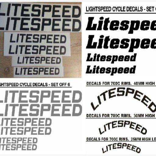 Litespeed bicycle frame and rim decals stickers / graphics kits. Precision machine cut from top quality exterior grade long life gloss vinyl ( UV resistant and fully waterproof ). These are not cheap ink printed stickers that fade / blur. The decals are also suitable for clear coating for added protection.