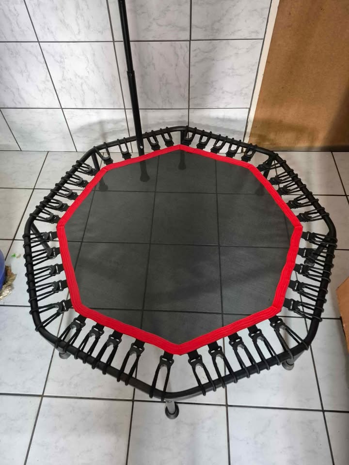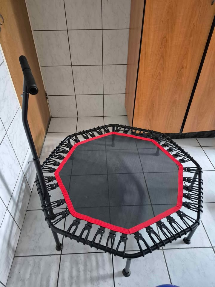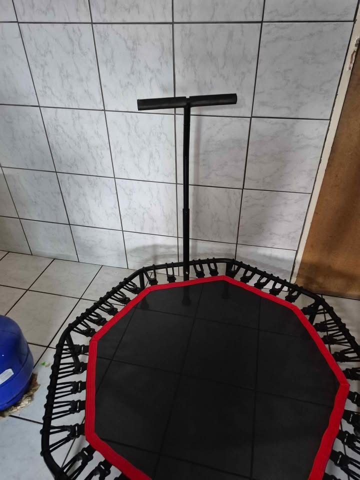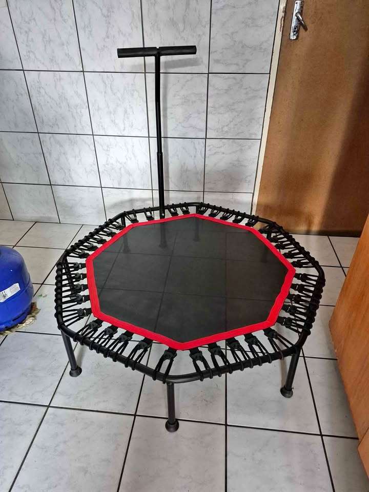 The handlebar is adjustable, providing stability and support during workouts. The trampoline is portable and can be used in various locations, such as a living room, bedroom, or home gym. It is often built with durable materials, such as high-tensile steel tubing, and can support a user's weight. Rebounding can improve circulation, strengthen muscles, and assist in lymphatic drainage.