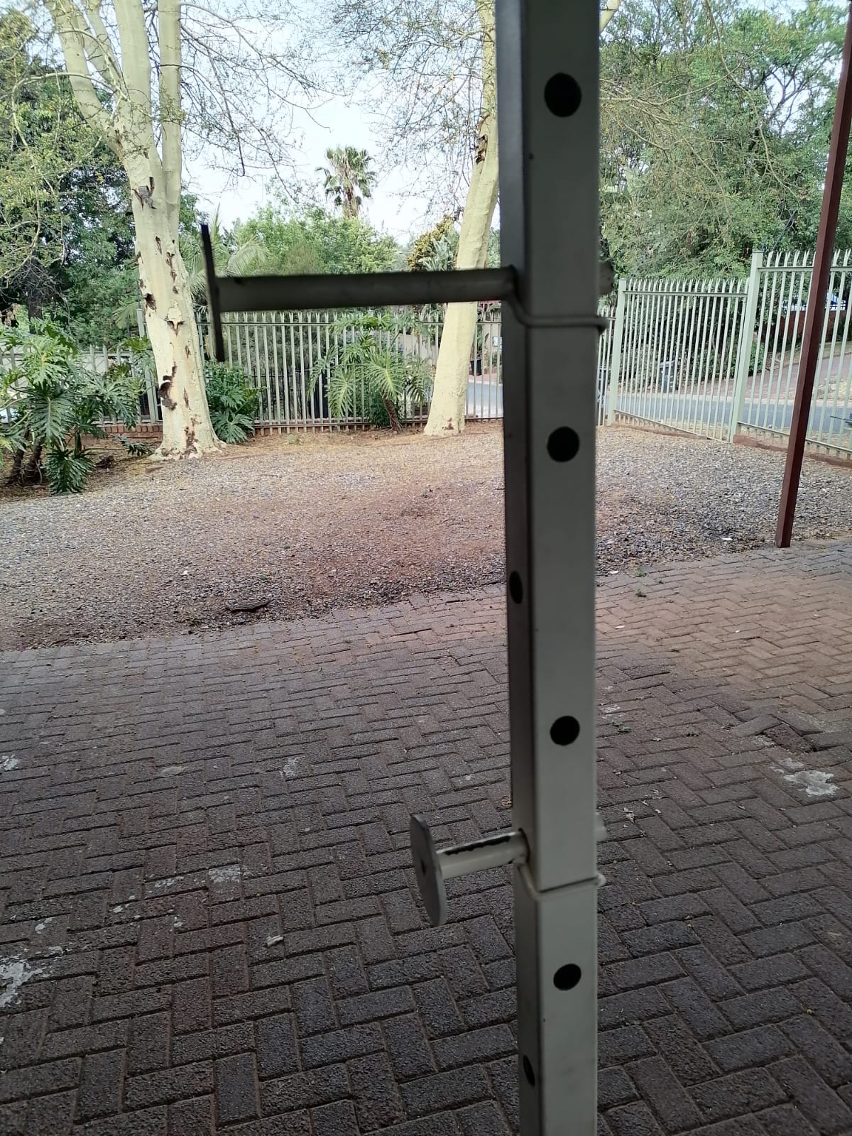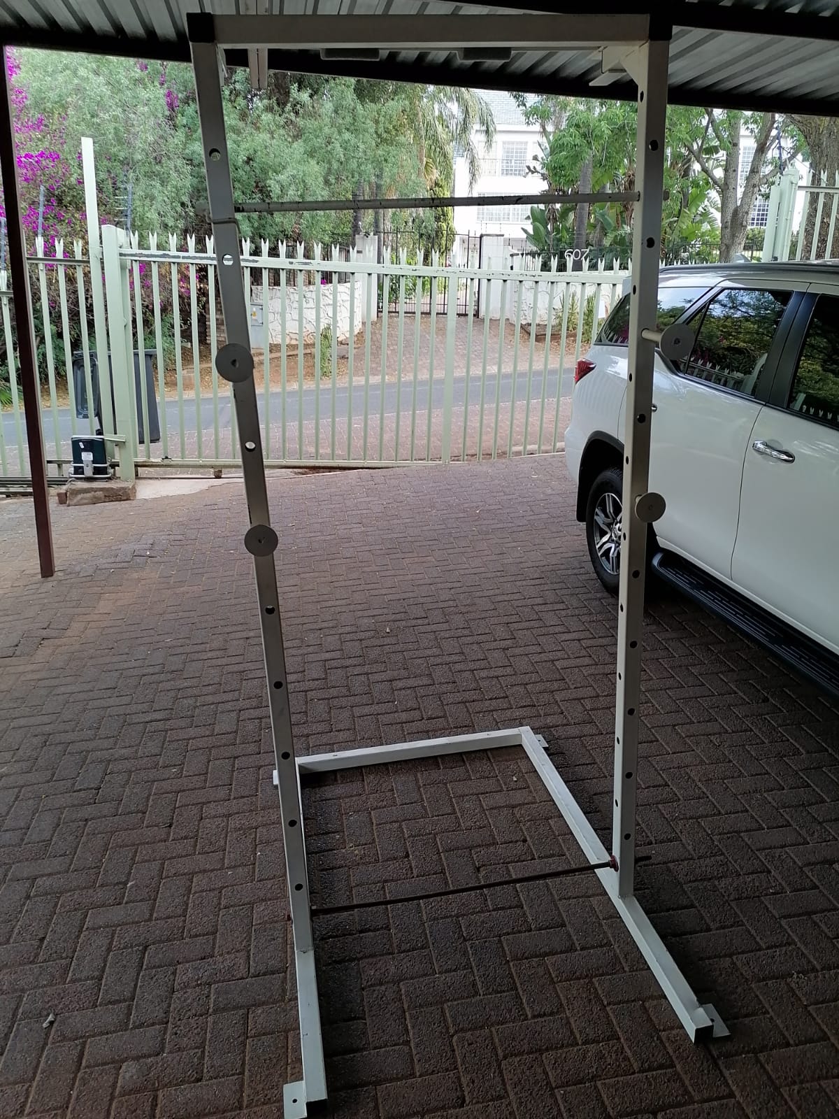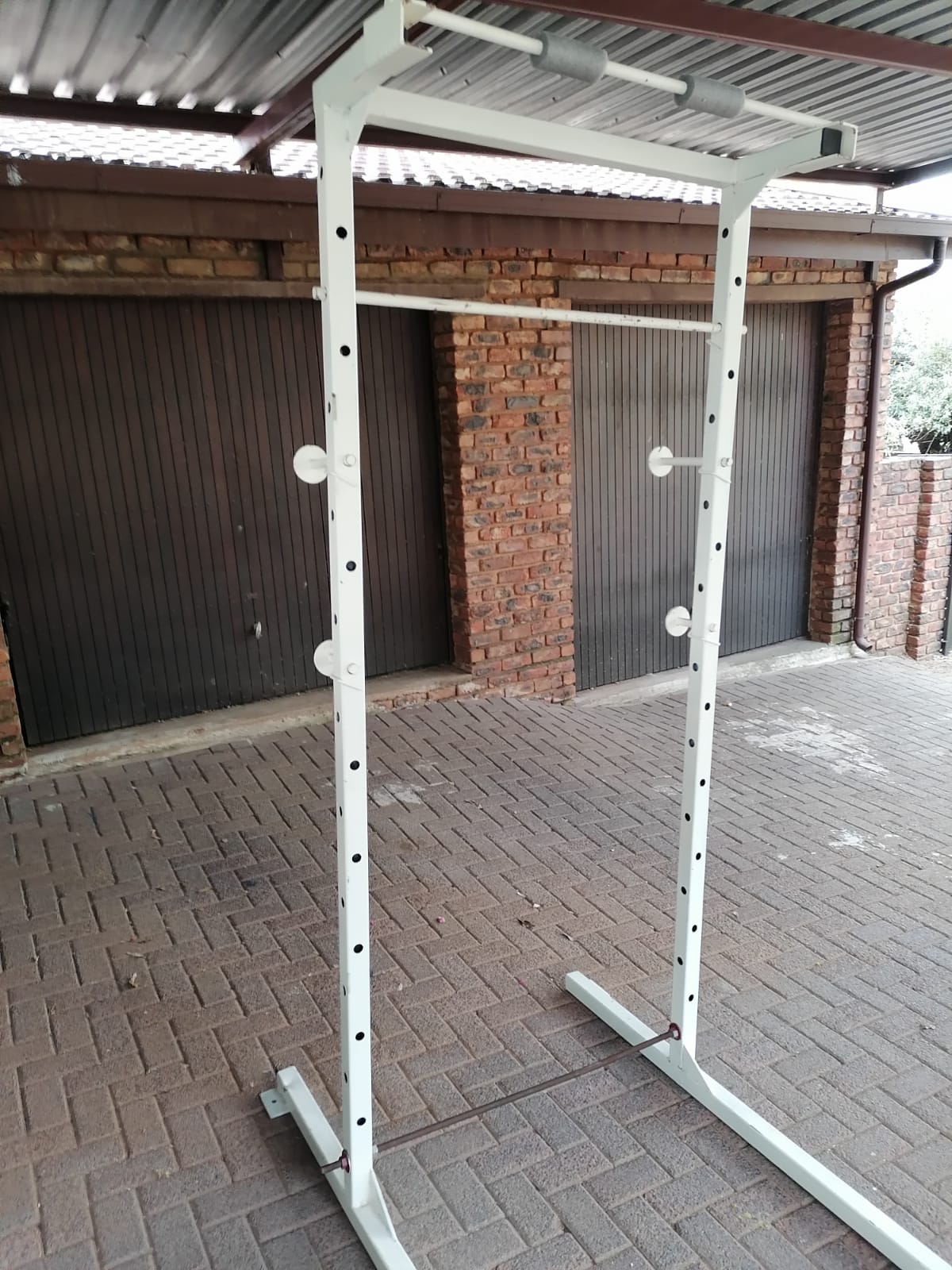 Custo made bench and squat rack with pull-up bar. Adjustable heights. Strong steel structure.