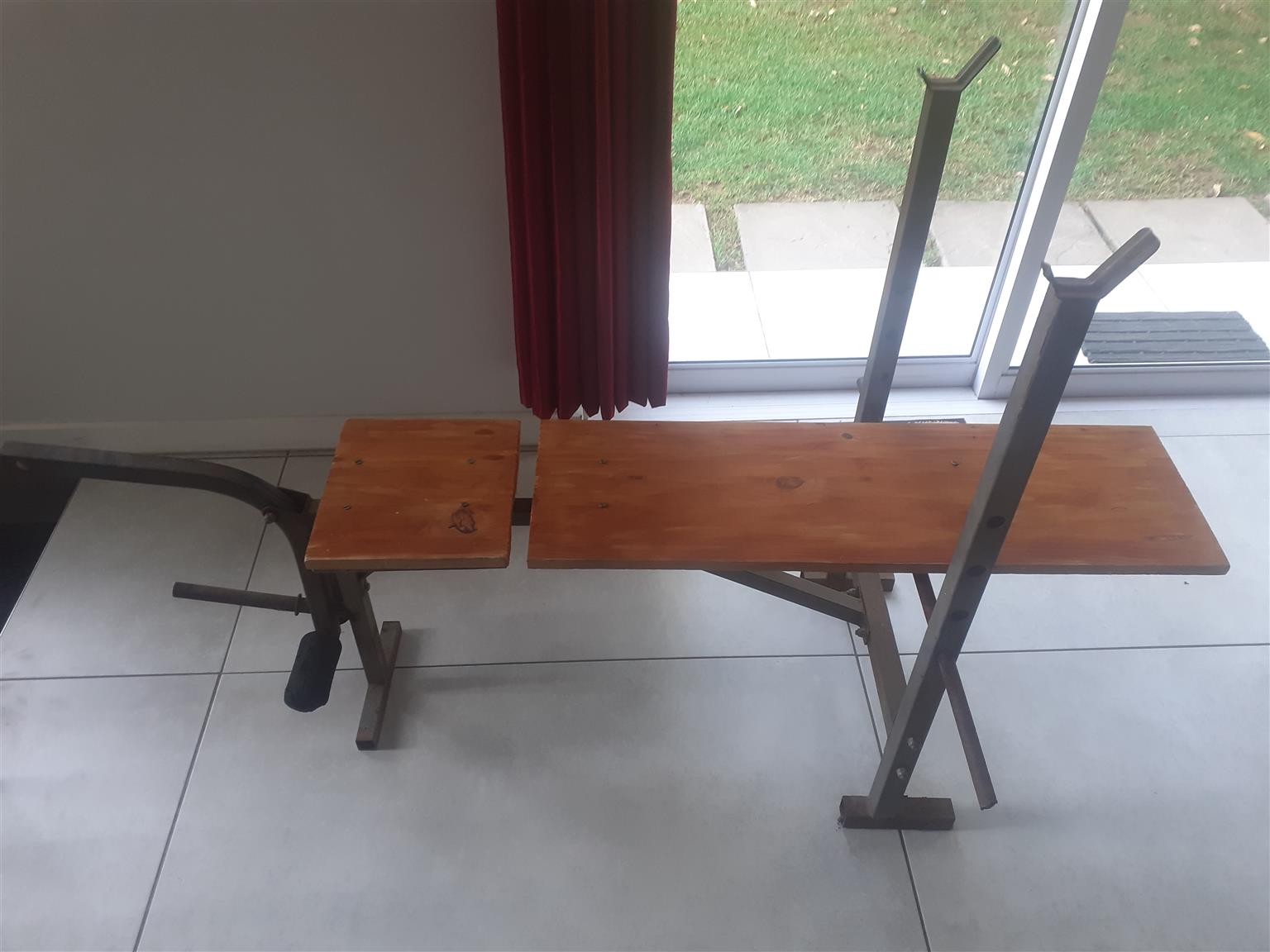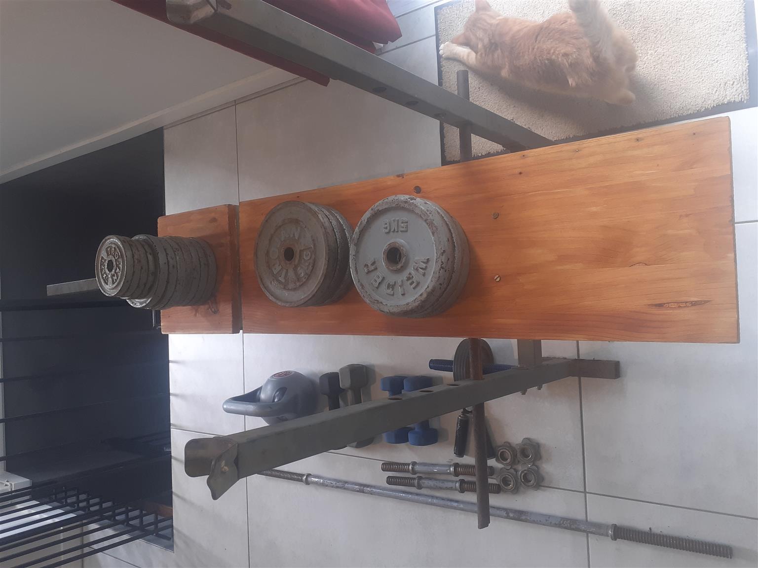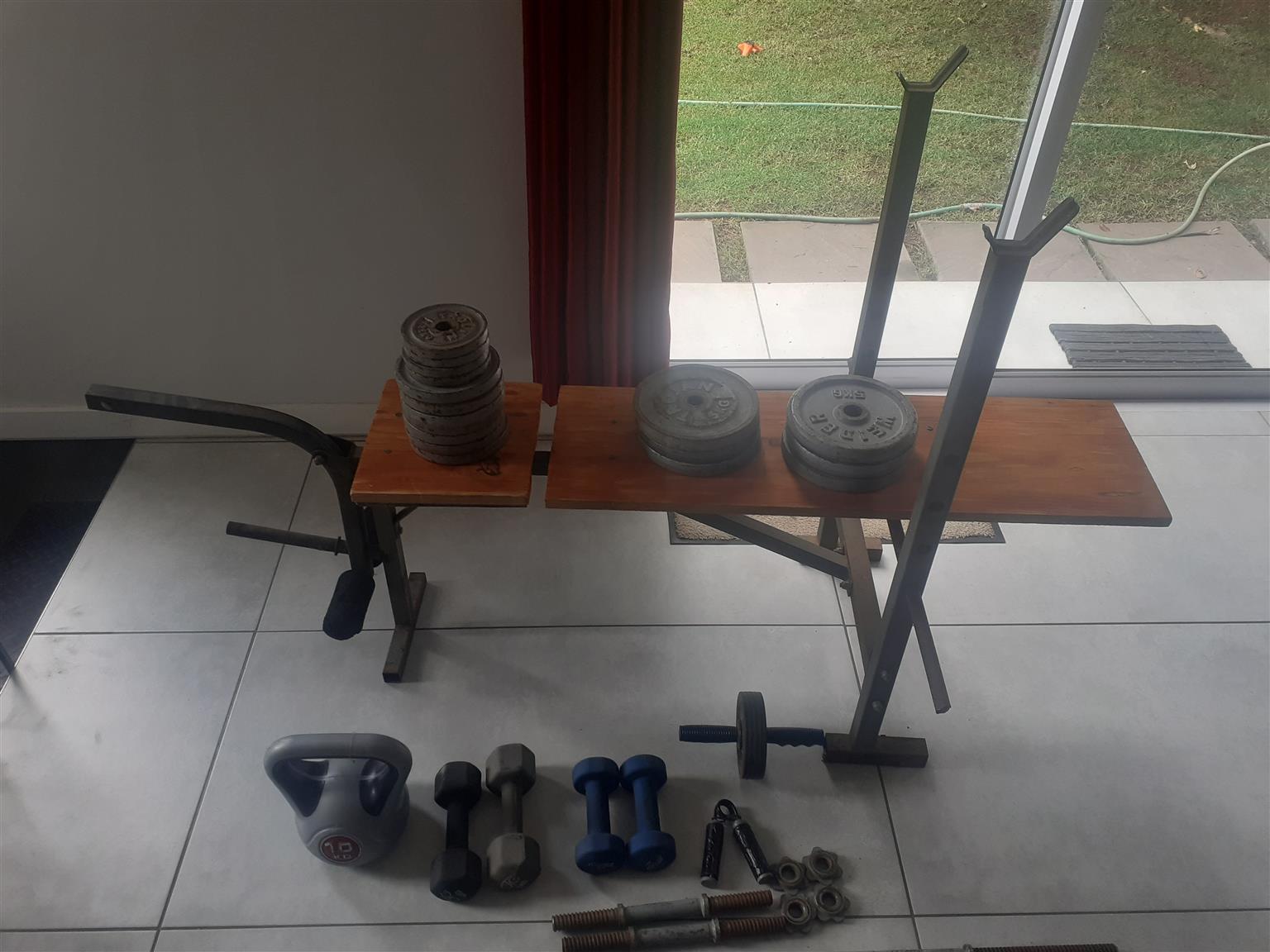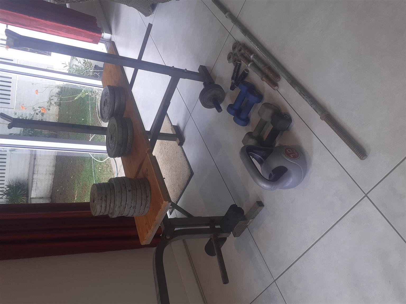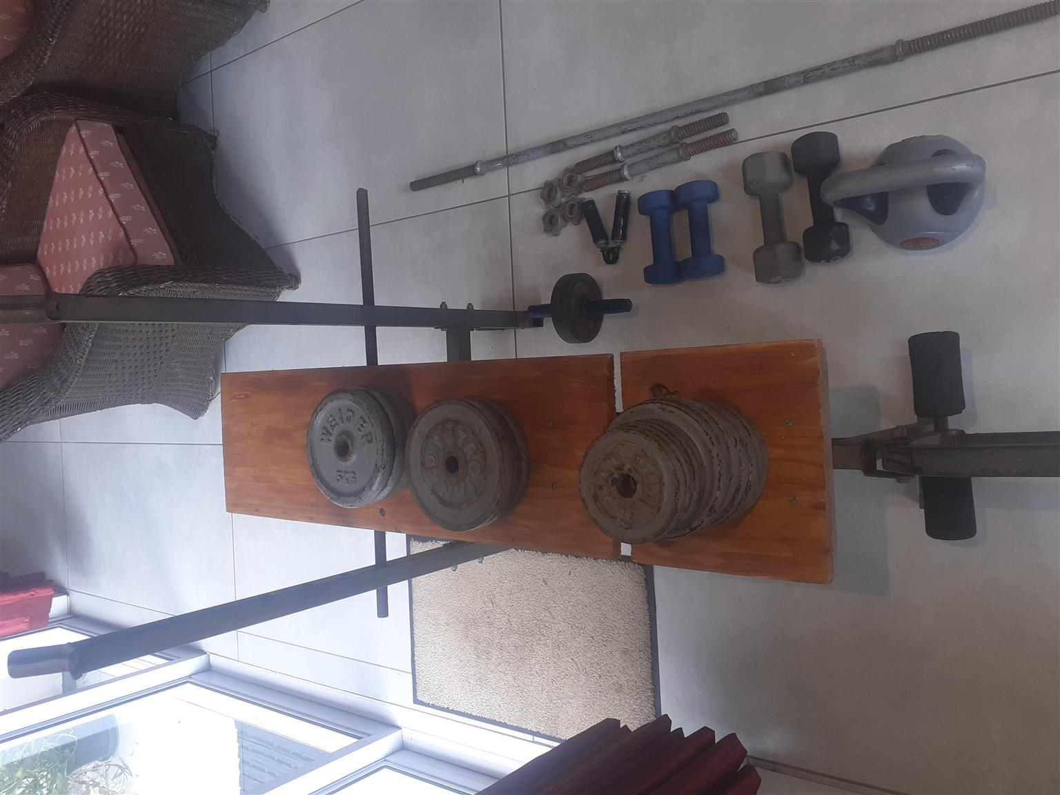 Assorted weights, Bench, Kettlebell, Barbell, 2 small barbells and locks. Dumbbells (2x 3kg, 1x4kg and 1x5kh), Ab Roller, forearm spring exerciser.