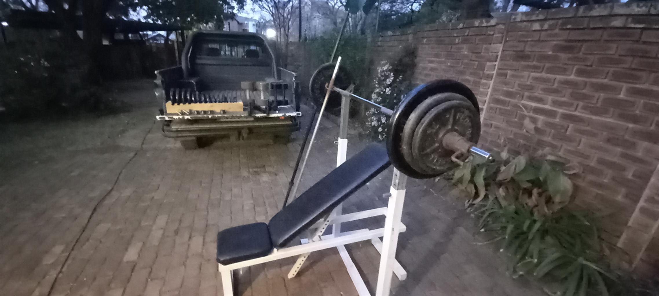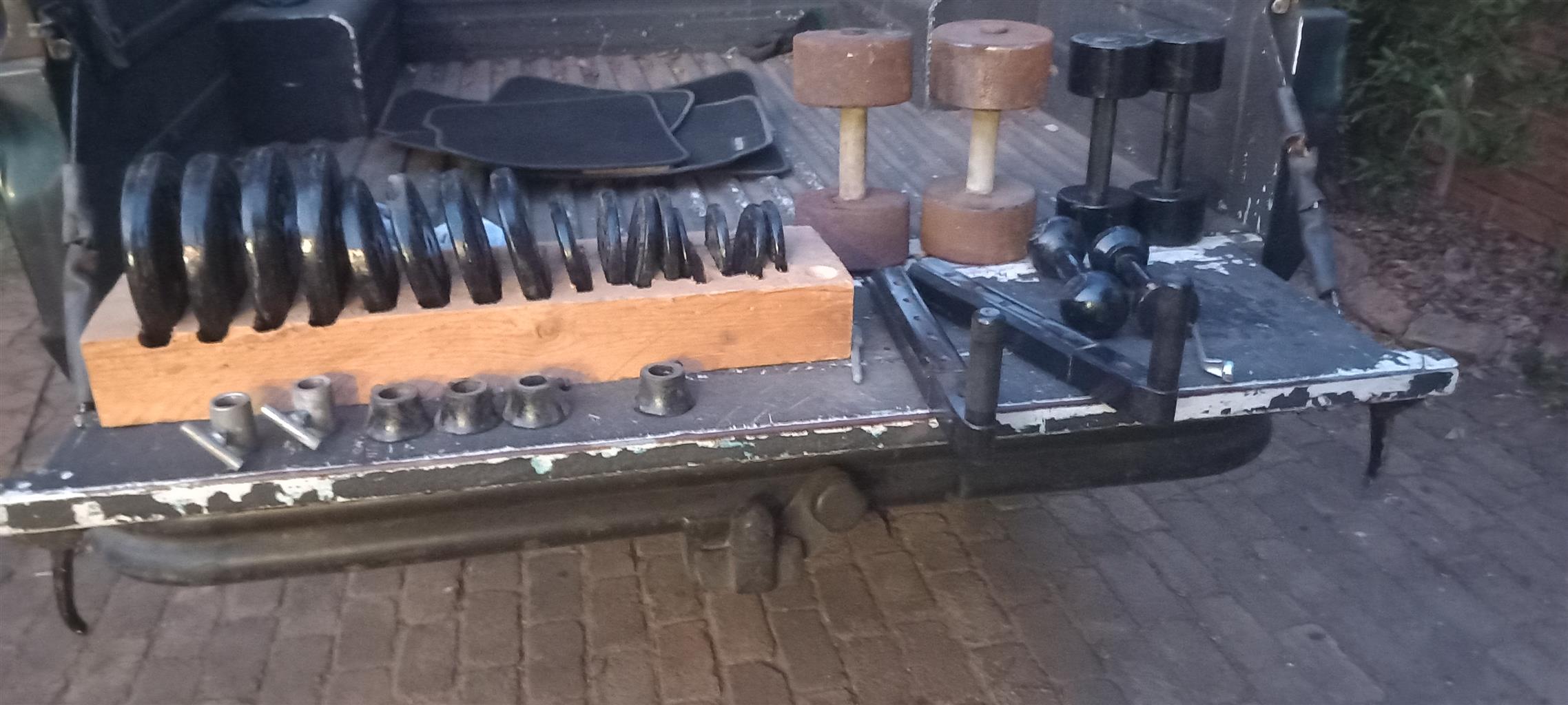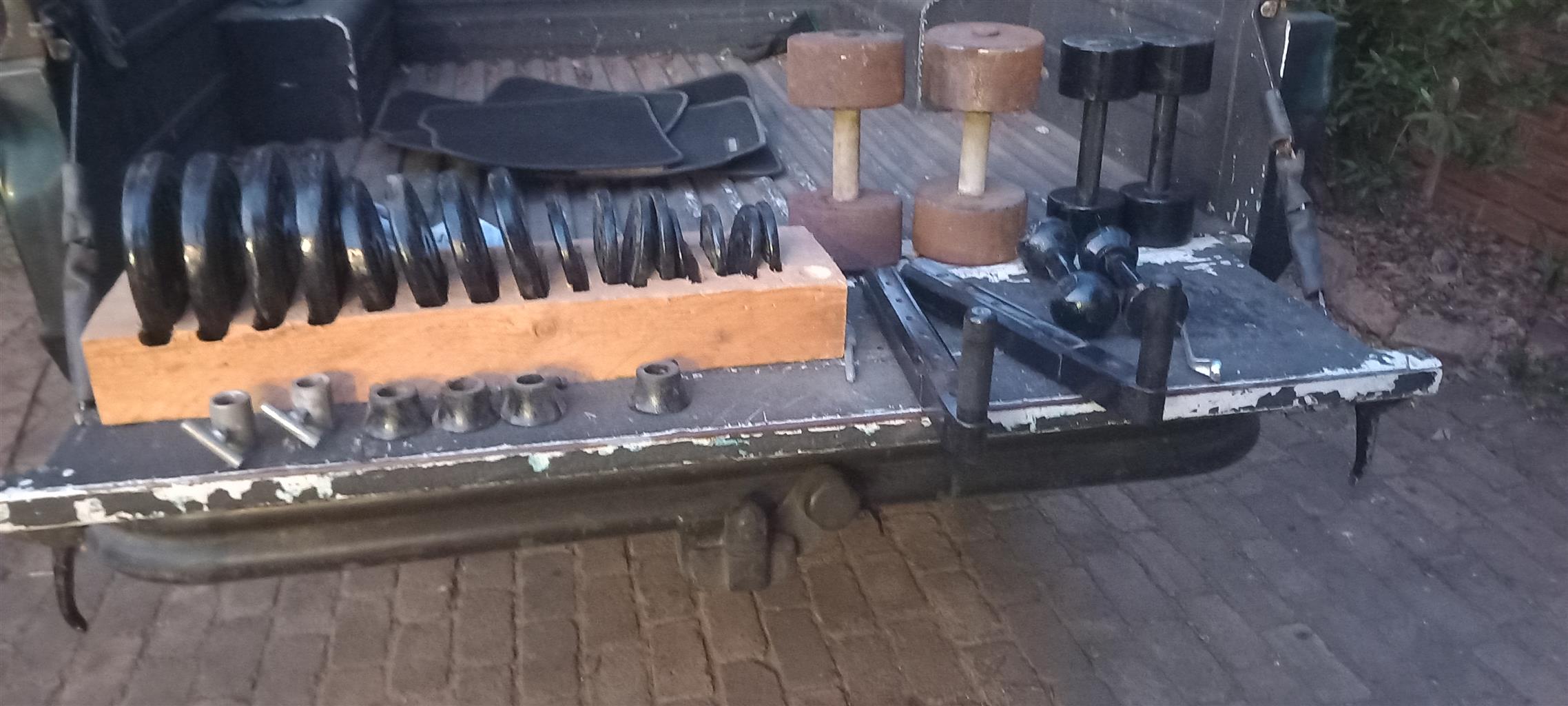 3x bars 2x adjustable dumbbells, 2x18kg dumbbells,2×8kg,1x3.5kg dumbell 100kg weight plates 15kg to 1kg,dipping bars,adjustable bench and standard.