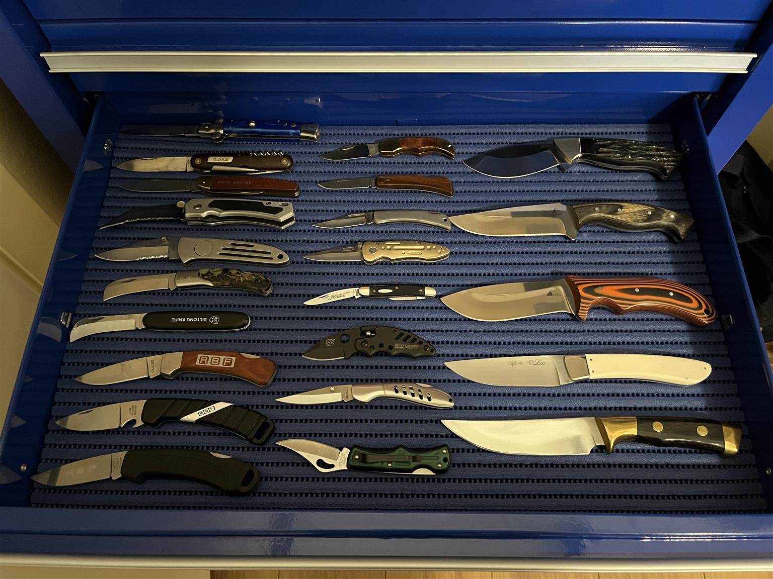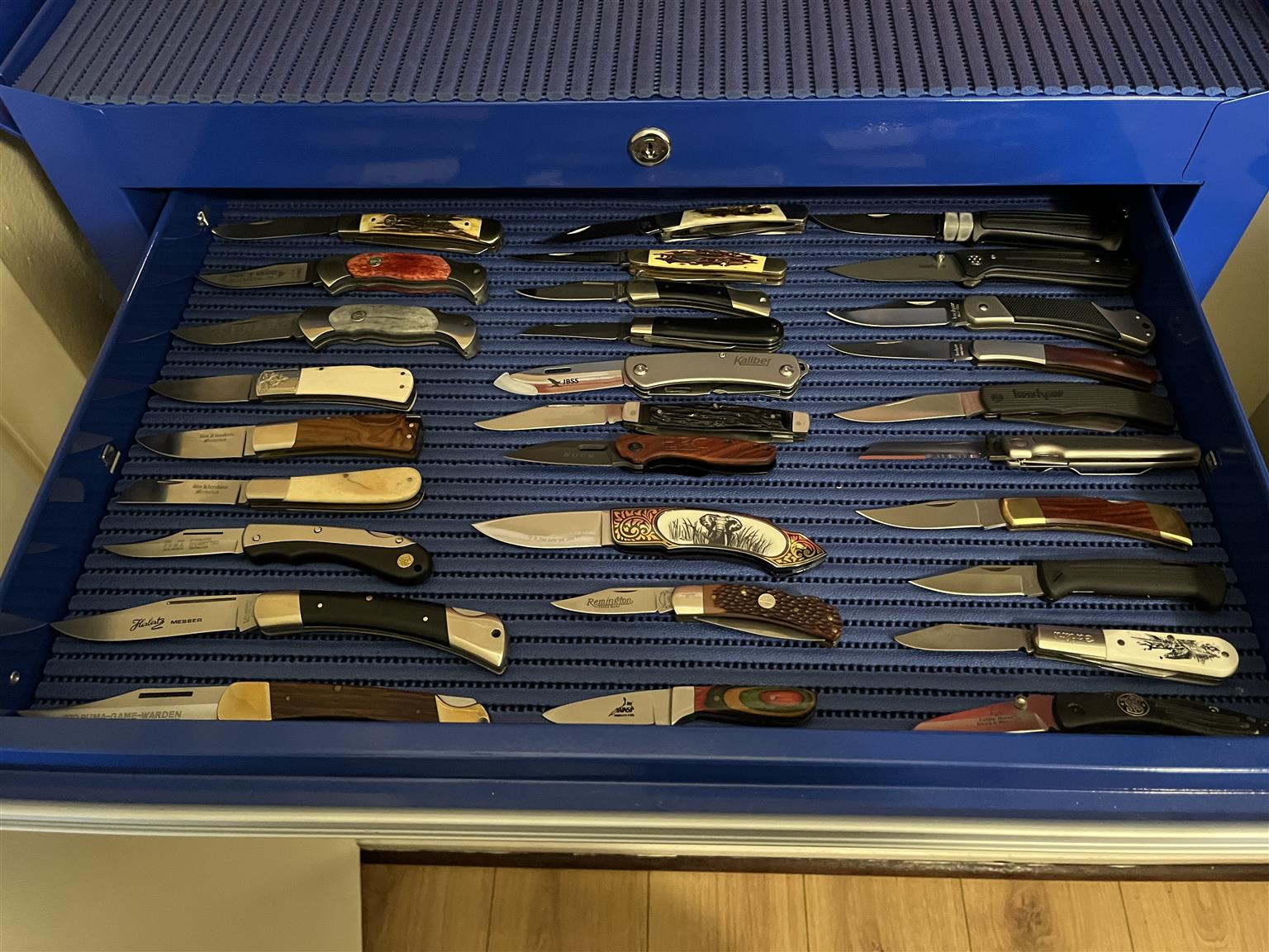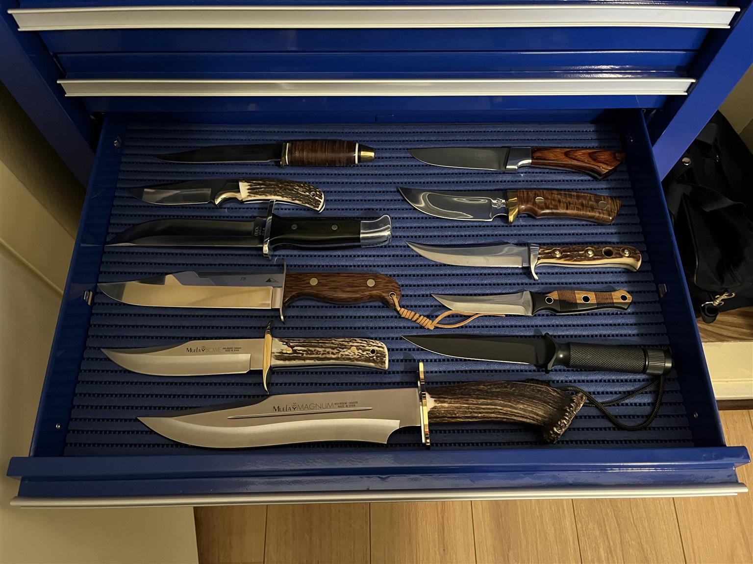 High-end knife collection in display cabinet. Lots of hand made custom knives . More details: