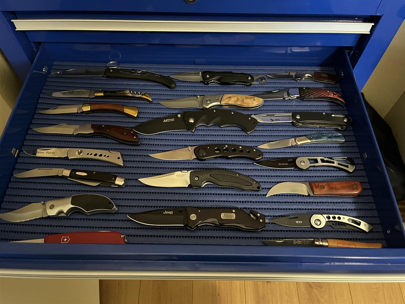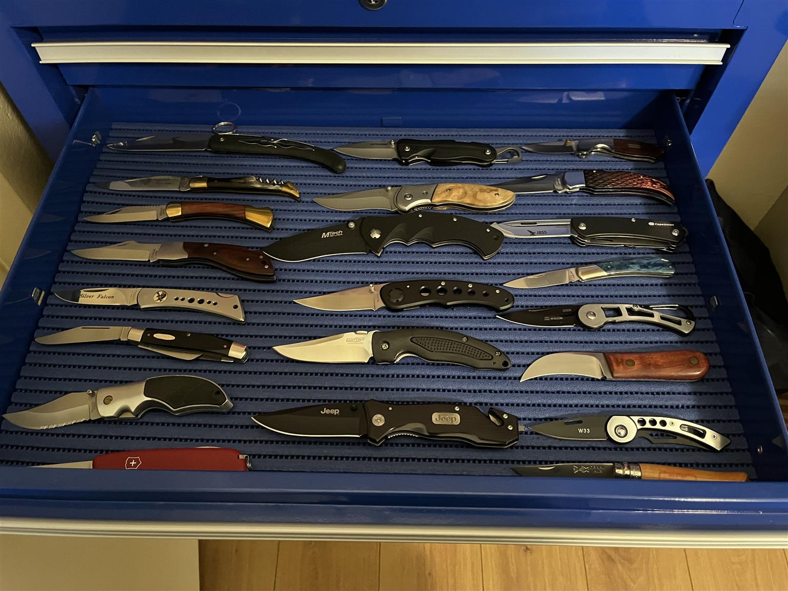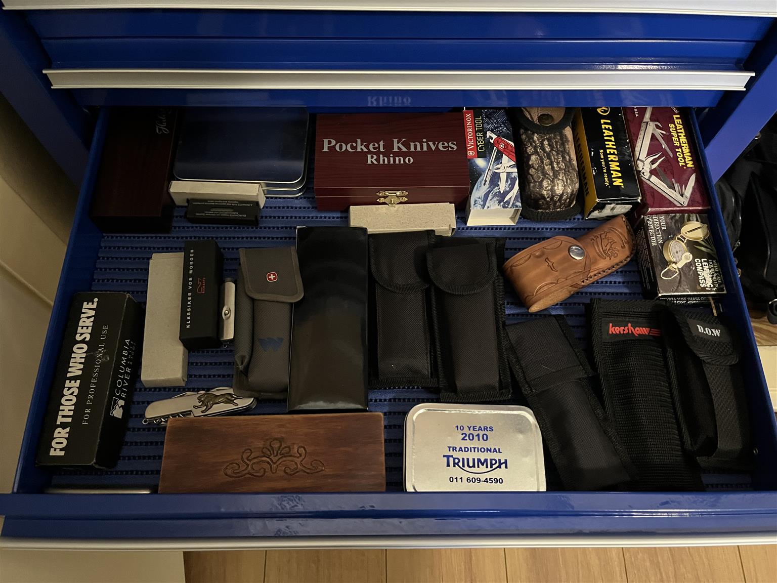 High-end knife collection in display cabinet. Lots of hand made custom knives . More details: