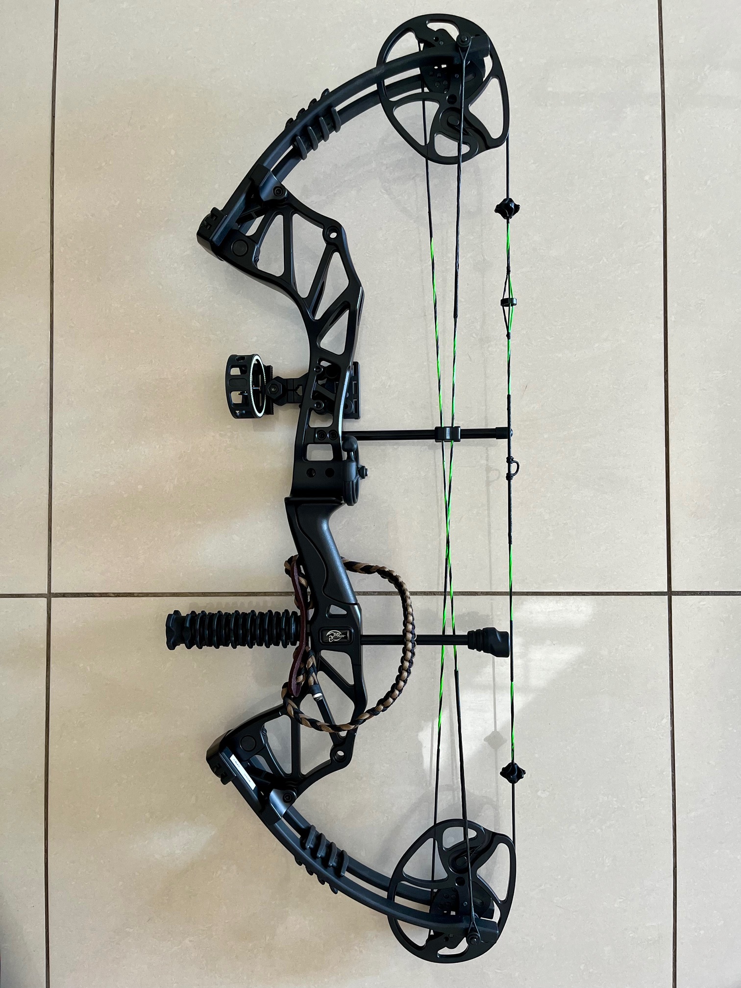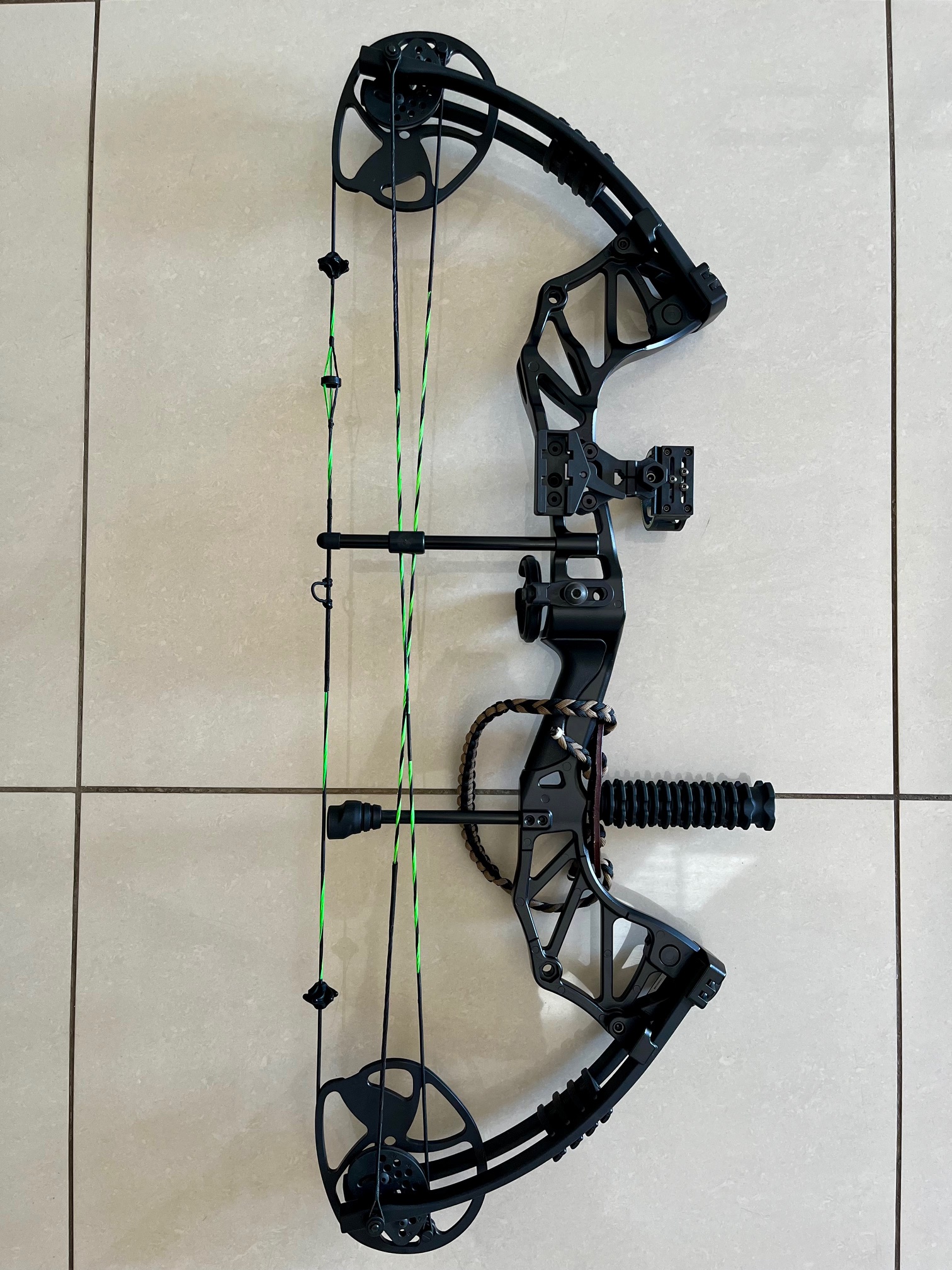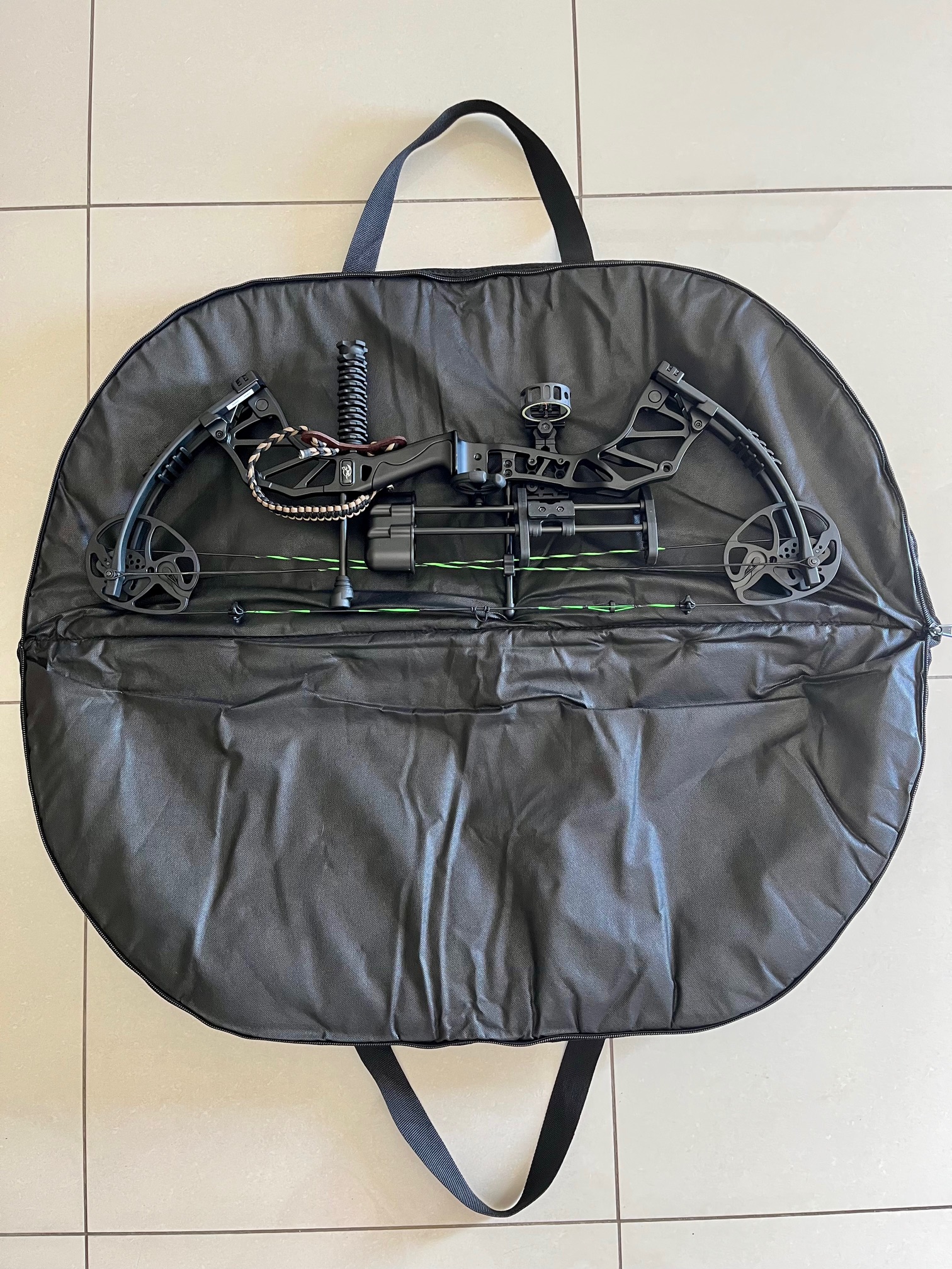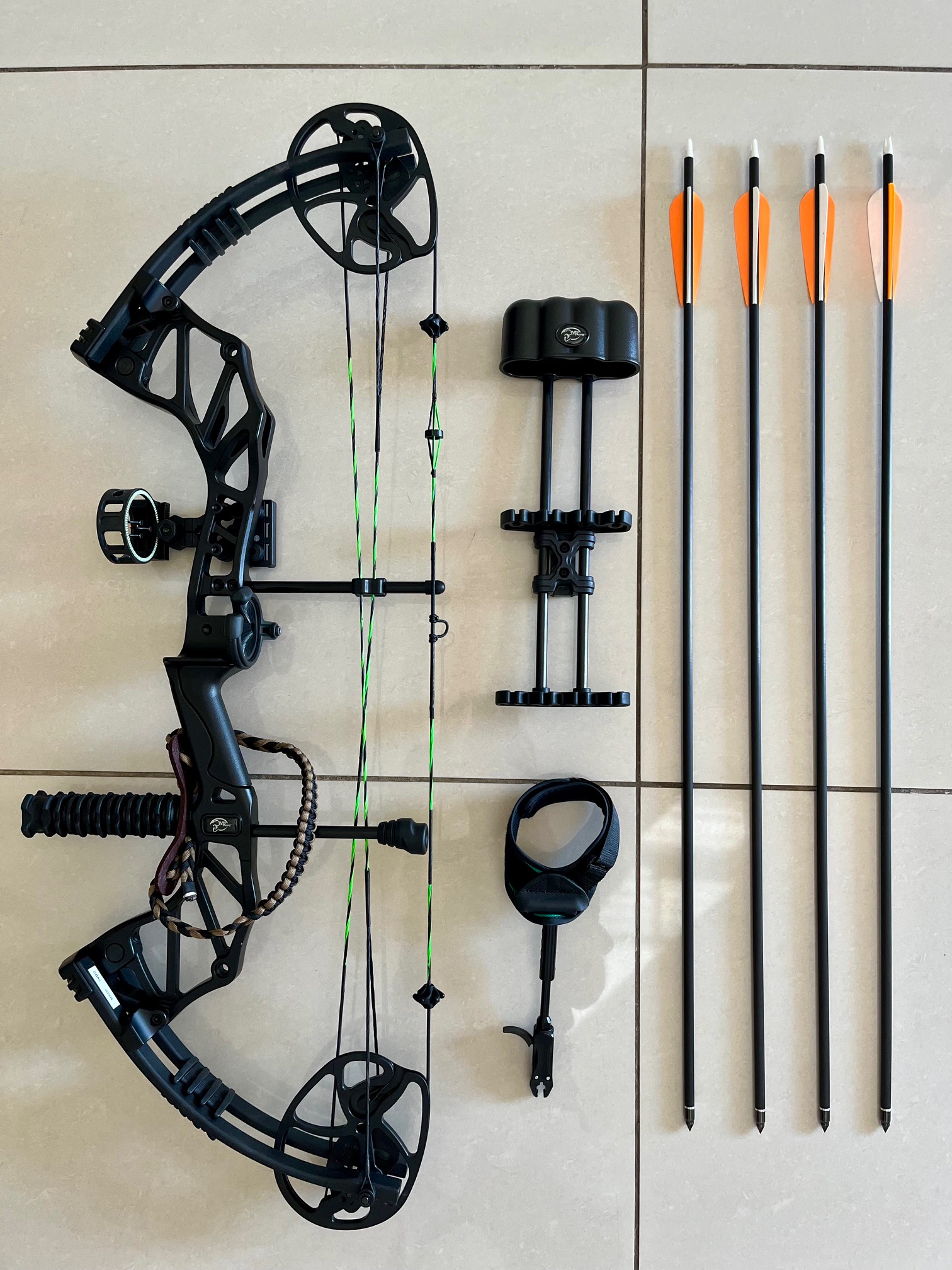 MK-CBA5BK black right handed compound bow kit. Draw weight adjustable from 30-70 LBS. Draw length adjustable from 19-31 inches. Velocity of 300+ FPS (at 30 LBS). Aluminium riser with fibreglass limbs. Weight of 1746 grams. Includes whisker biscuit arrow rest, sight, peep sight, d-loop, release, stabilizer and 5 x carbon arrows. Comes with black canvas carrying case. Brand new, has never been used.