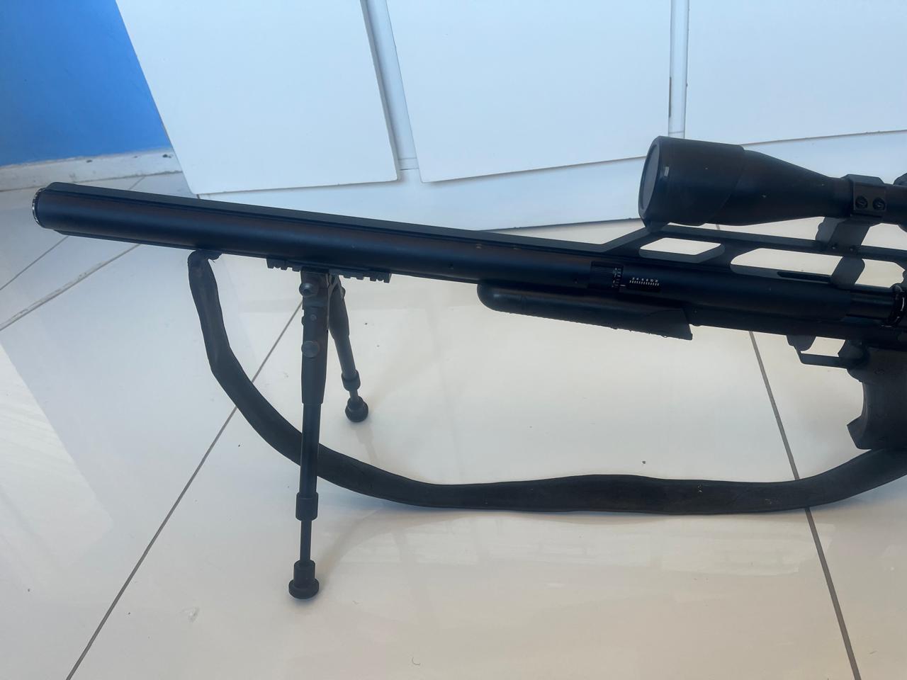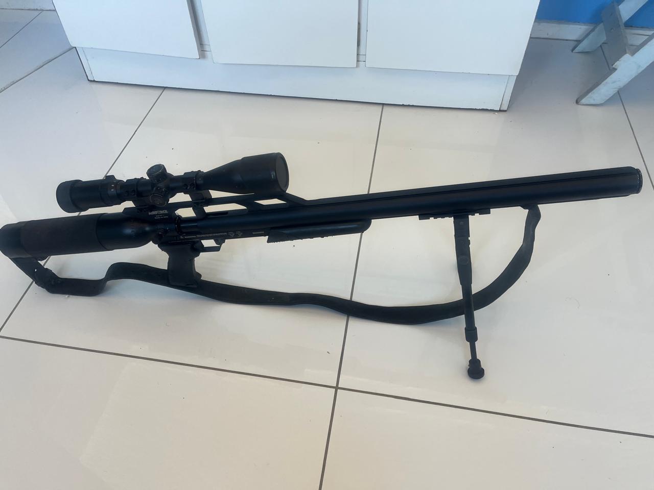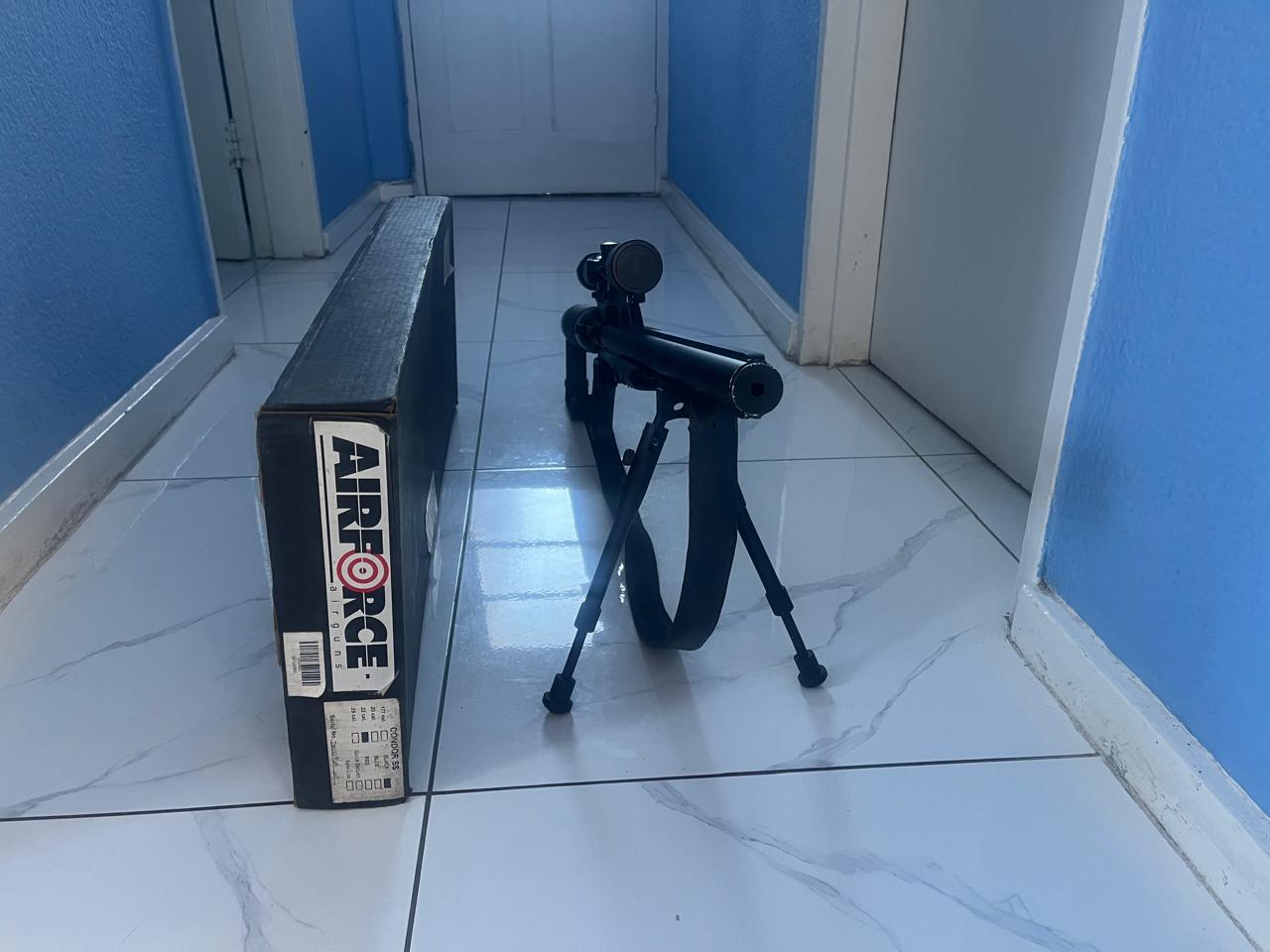 This powerful PCP is a .22 calibre and can generate more than 75 Foot Pounds depending on pellet weight and how you move the power adjustment wheel. Its a powerful hunting tool for small game. The rifle is accurate. The condition is good. No problems with its functions. Comes with original Airforce box, scope and genuine leather sling. A strong American (Texas) gun, easy to use, reliable and no double feed when shooting. What a bargain for this price!