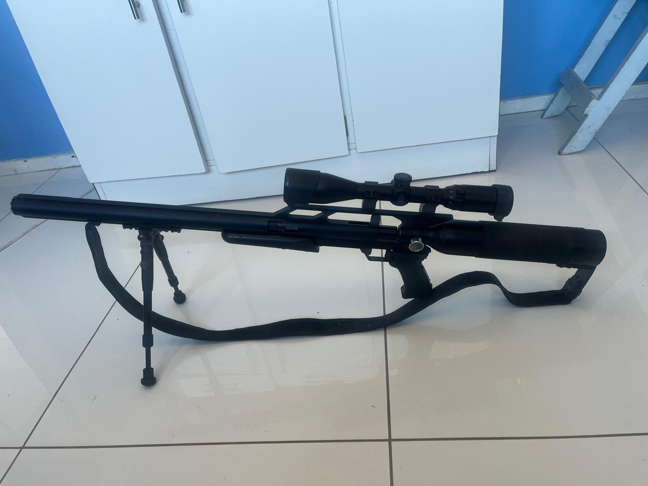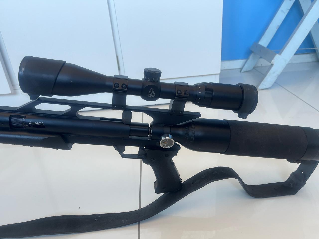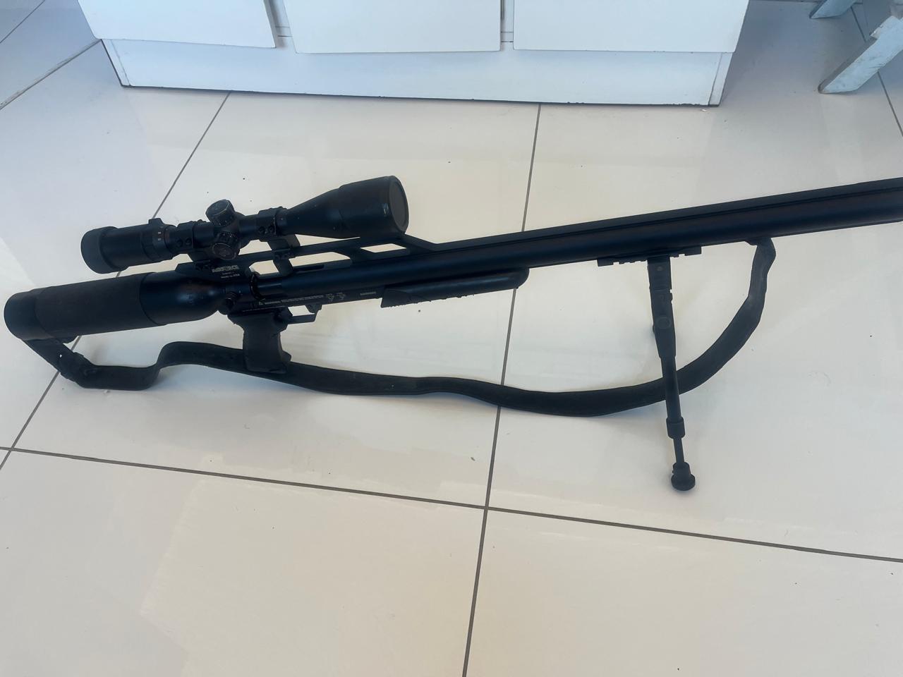 This powerful PCP is a .22 calibre and can generate more than 75 Foot Pounds depending on pellet weight and how you move the power adjustment wheel. Its a powerful hunting tool for small game. The rifle is accurate. The condition is good. No problems with its functions. Comes with original Airforce box, scope and genuine leather sling. A strong American (Texas) gun, easy to use, reliable and no double feed when shooting. What a bargain for this price!