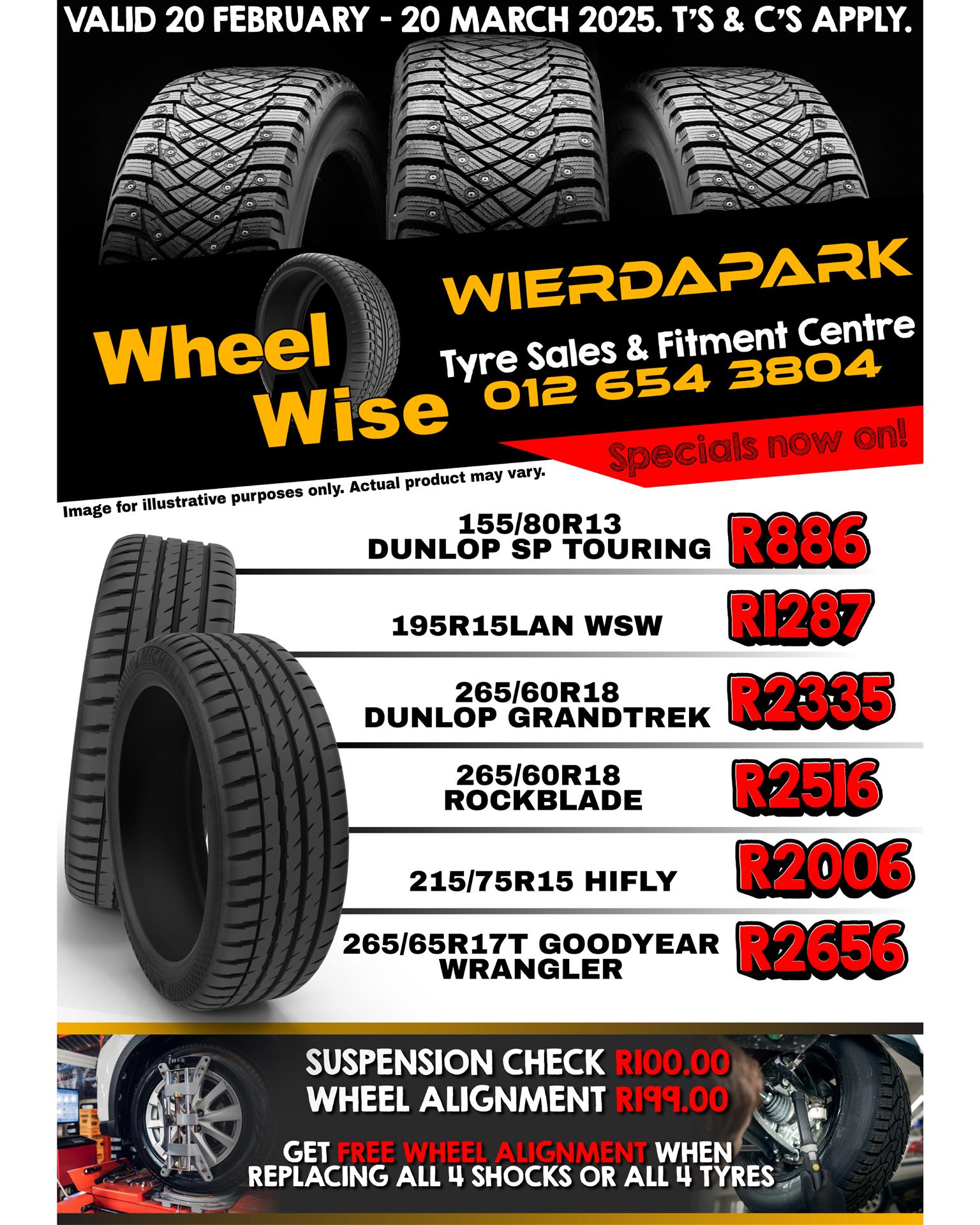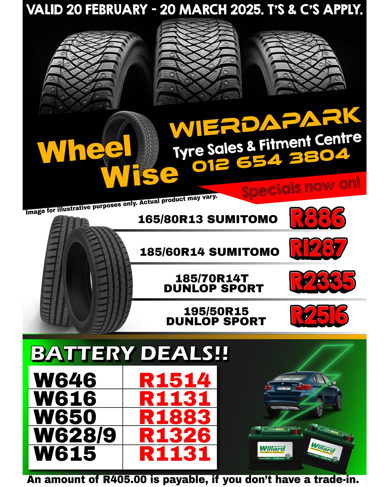#WheelWise #ChargedUpDeals #TiredOfBadTyres #PowerUpAndRoll #WheelWise #Wierdapark #WillardBatteries #DunlopTyres #Sumitomo