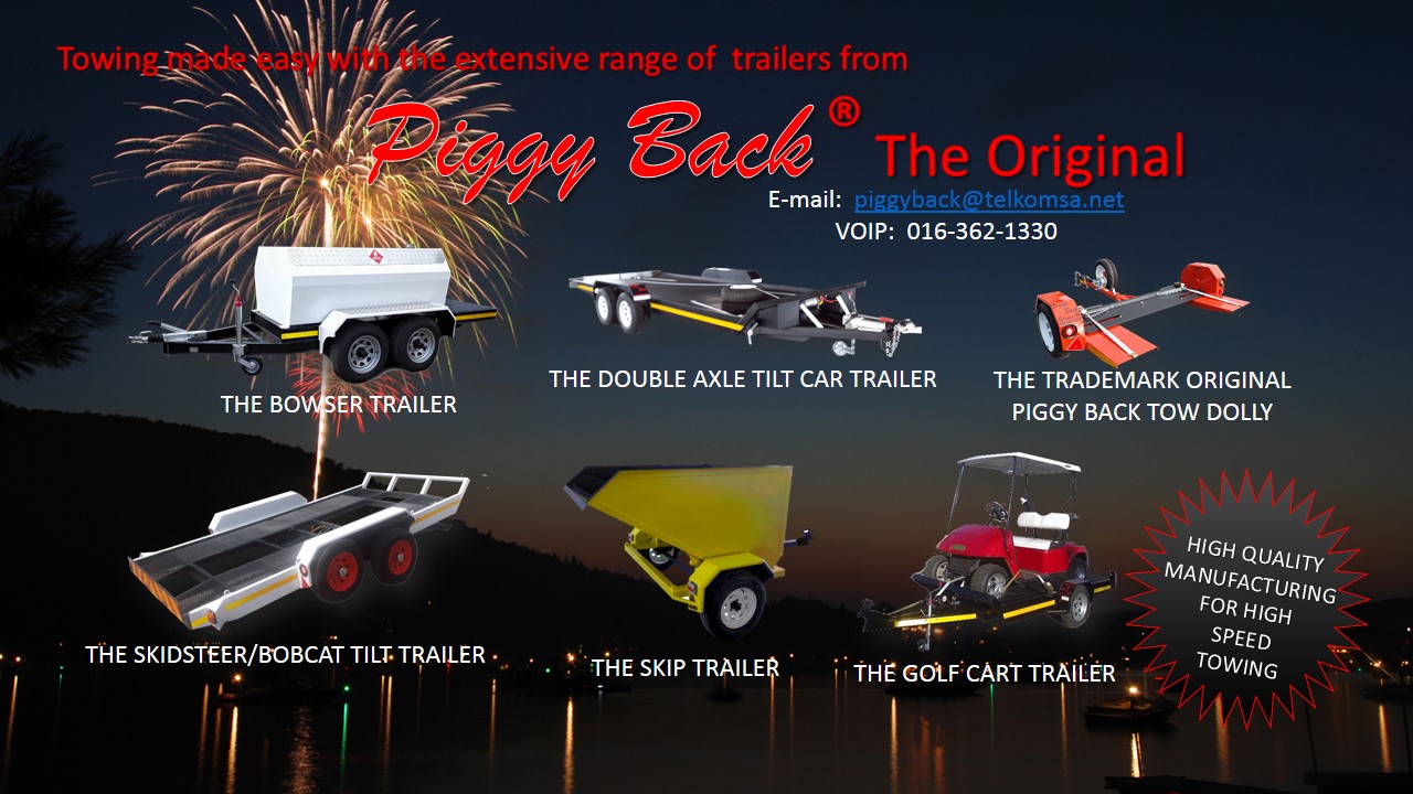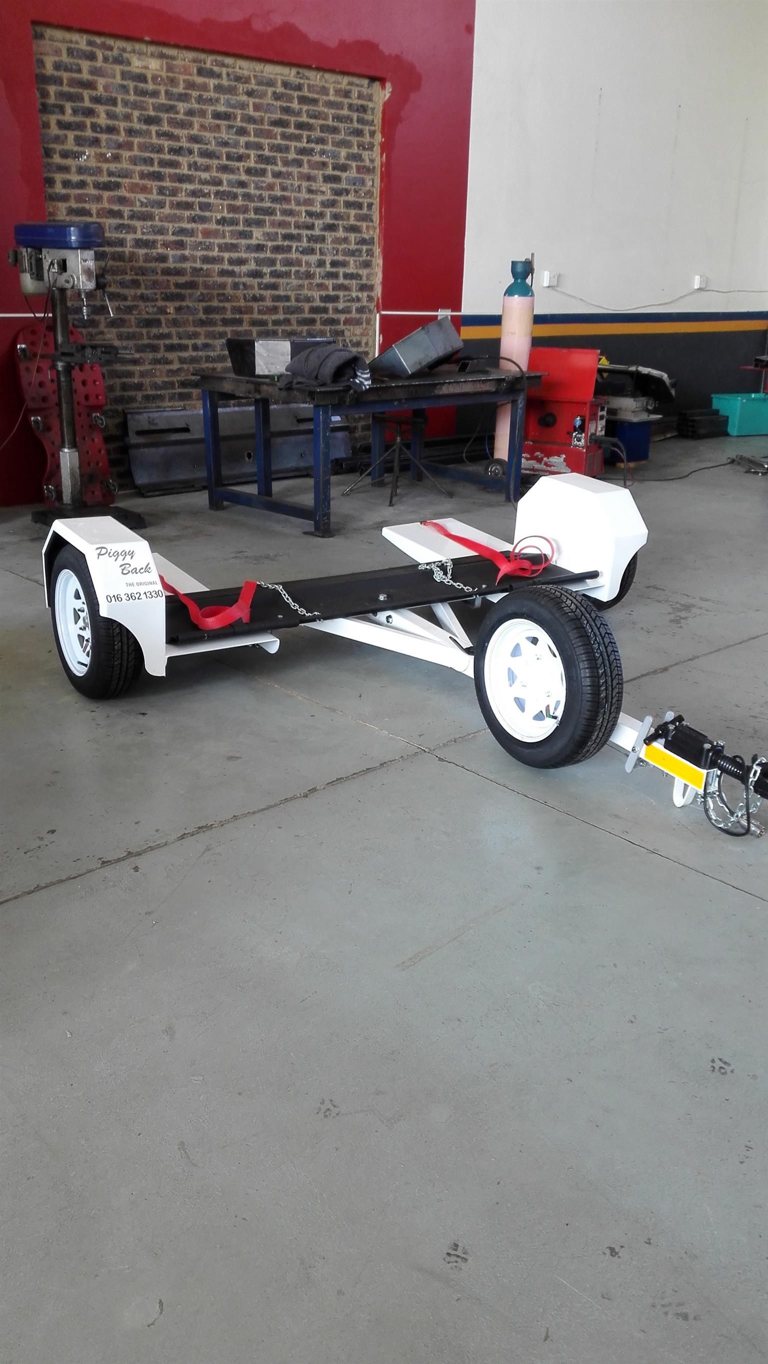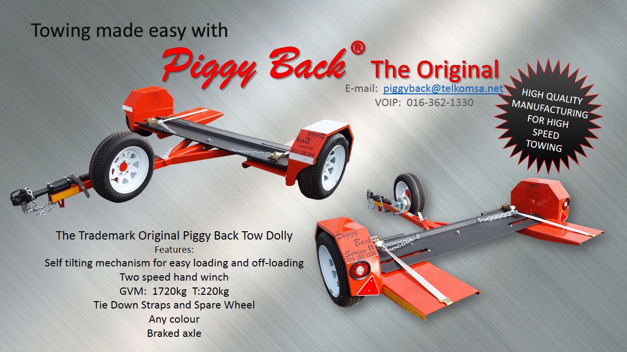 The original tow dolly manufactured by Piggy Back Trailers - The Registered Trademark Holders of Piggy Back Tow Dollys. Quality manufactured for high speed towing. Features: Braked axle, spare wheel, winch and straps. SABS/NRCS approved.