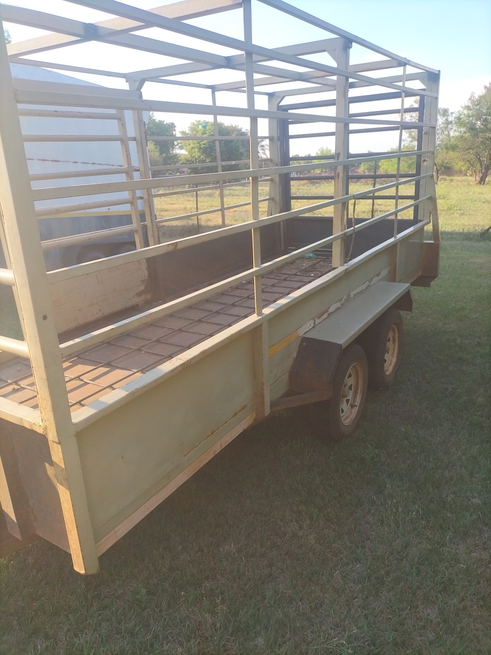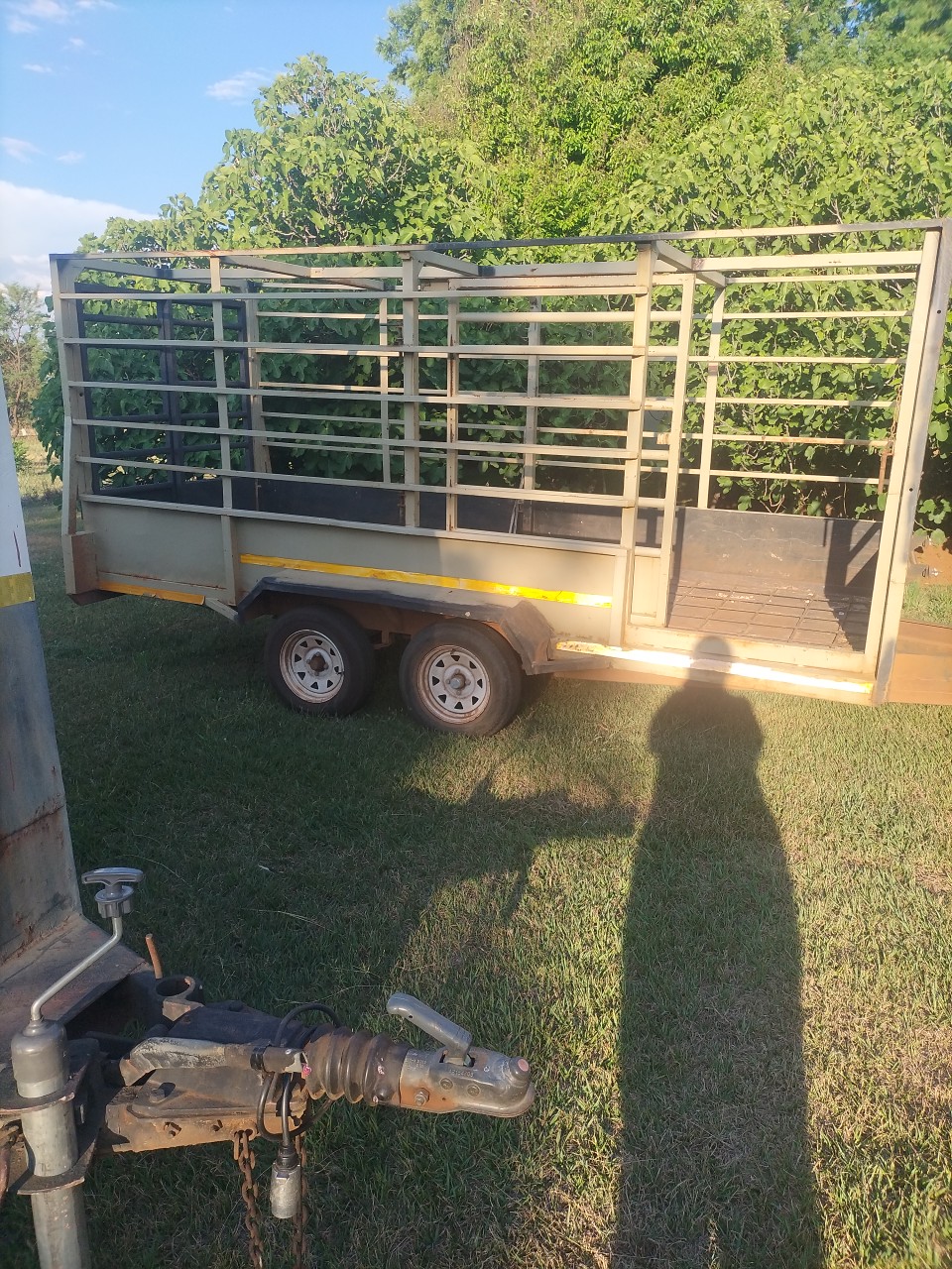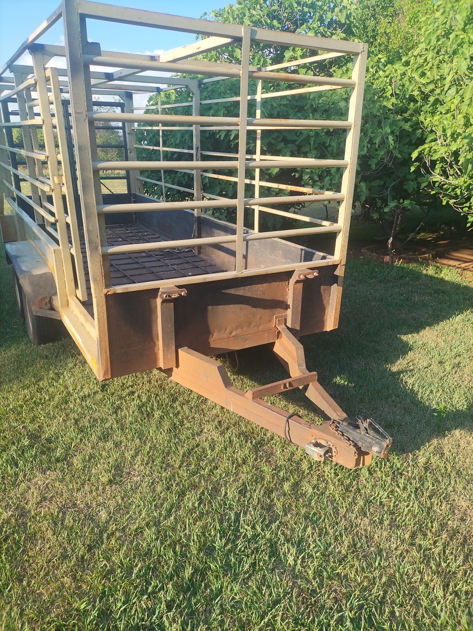 4m Cattle trailer. Excellent condition, mid separation divider, front middle and back sliding gates for easy use. Lights working 3 new tyres new front axil