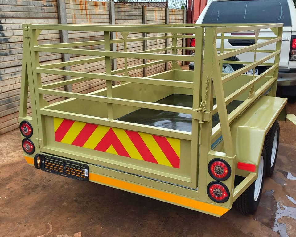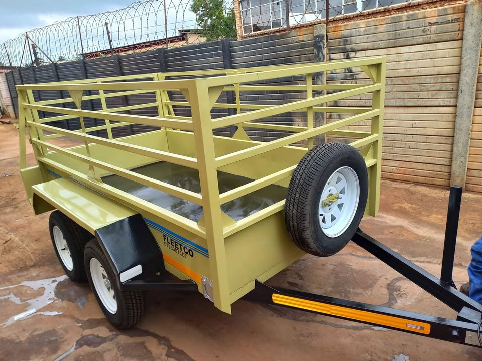 Contact Jeunice Grobler to place an order 068 332 3203view more whatsapp is welcome. 2.450m x 1.280m x 1m double axle unbraked trailer built brand new with 13" wheels plus spare wheel, standing pole in the front, LED 3 in 1 lights, a steel license disc holder and a universal lock. We are SABS approved, factory located in Westonaria The price includes vat, ID dot, papers and already through the test.