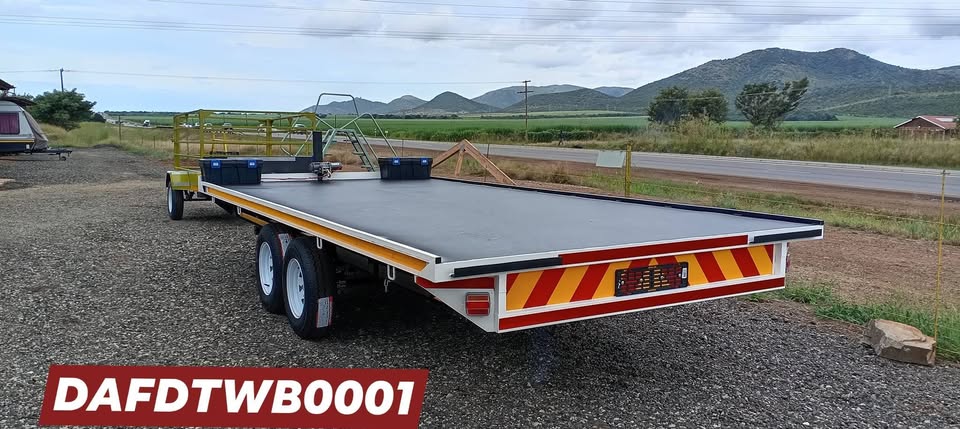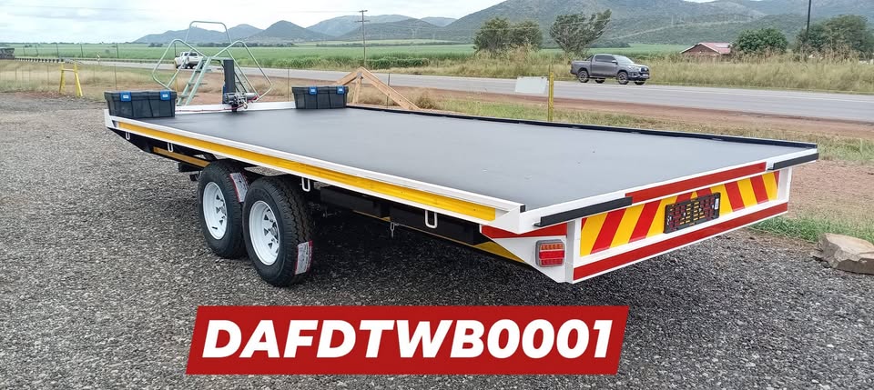 New Double Axle Flat Deck Trailer With Brakes On Order Sparewheel Additional 14" Rims & Tyres Papers Included 2 x Slide In Ramps Trailer Size (2.4m x 6m) Trailer PriceWas (R65000,00) As On Photo On Special Now for R59000,00 (Price Differ If Size is smaller) Malelane Komatipoort Hectorspruit Nelspruit Witbank Middelburg Baberton Witrivier & All surrounding Areas For Photos & Information Contact 0634891956view more 0721921790view more Code - DAFDTWB0001