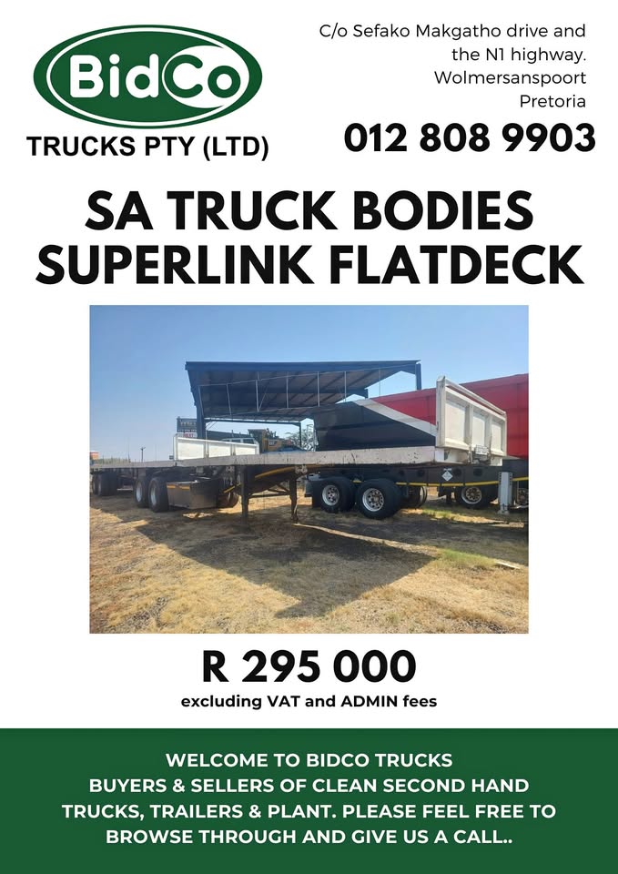Visit us at our yard for more trucks, trailers and plant equipment. We thrive to help you in expanding your fleet. If we don't have it we make it our mission to find it for you. - Prices are excluding vat and admin fees. AVAILABLE TO VIEW AT: Bidco Trucks C/o Sefako Makgatho drive and the N1 highway. Plot 28, Wolmeranspoort, Pretoria, 0035 TEL: / 4 / 5 WHATSAPP: LEVISON: OR JULIUS: .