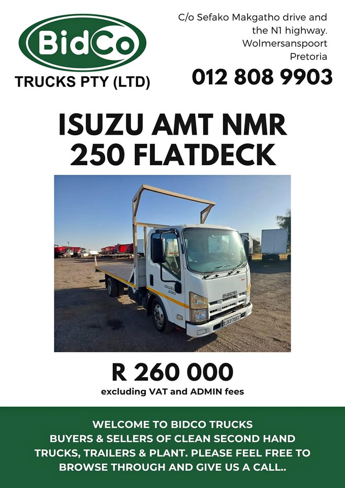 Visit us at our yard for more trucks, trailers and plant equipment. We thrive to help you in expanding your fleet. If we don't have it we make it our mission to find it for you. - Prices are excluding vat and admin fees. AVAILABLE TO VIEW AT: Bidco Trucks C/o Sefako Makgatho drive and the N1 highway. Plot 28, Wolmeranspoort, Pretoria, 0035 TEL: / 4 / 5 WHATSAPP: LEVISON: OR JULIUS: .