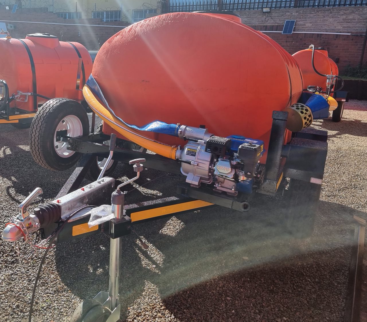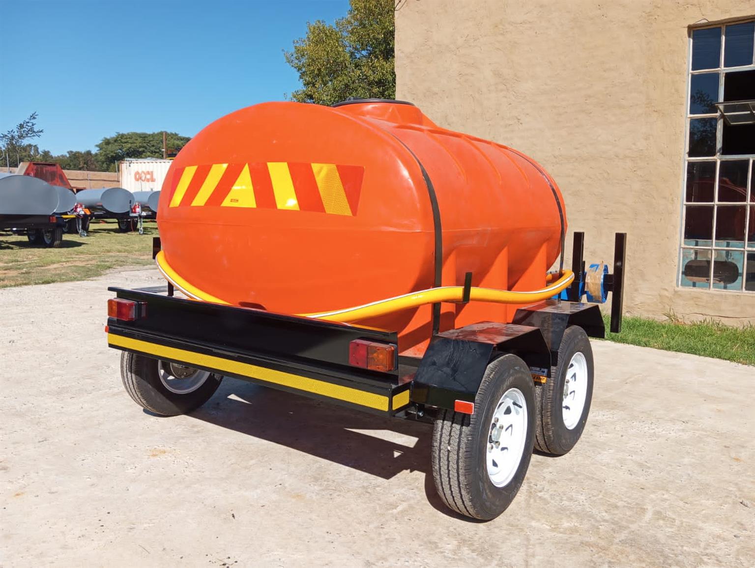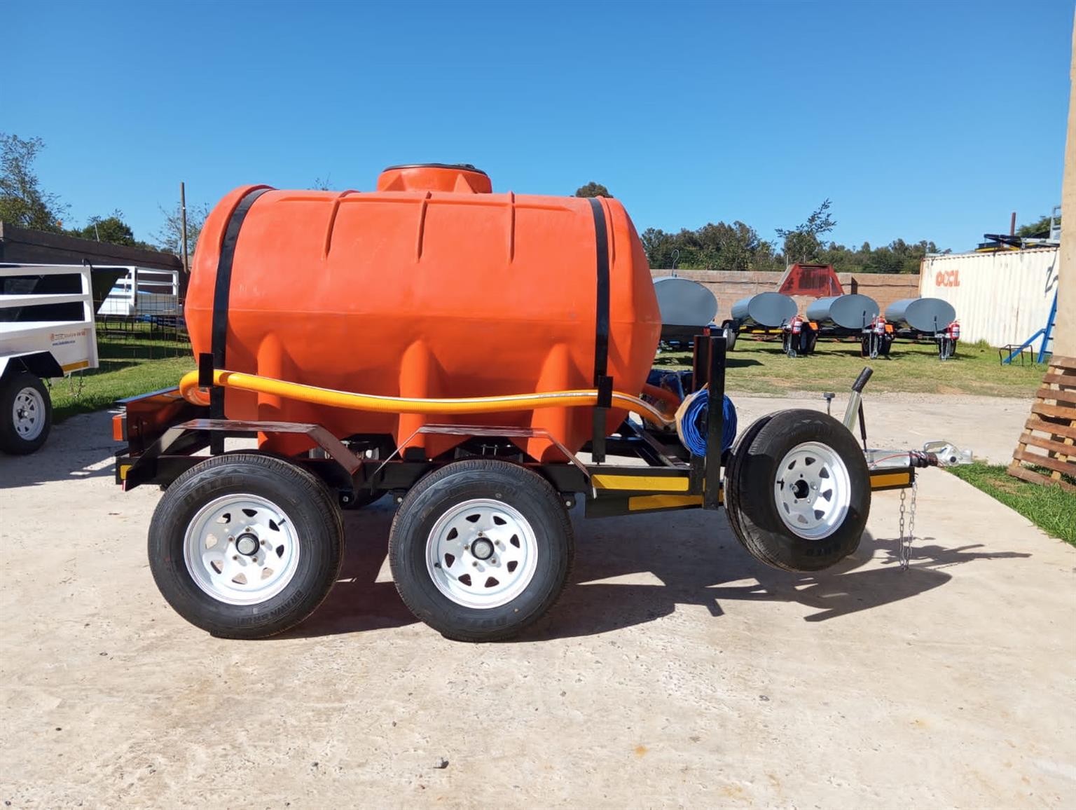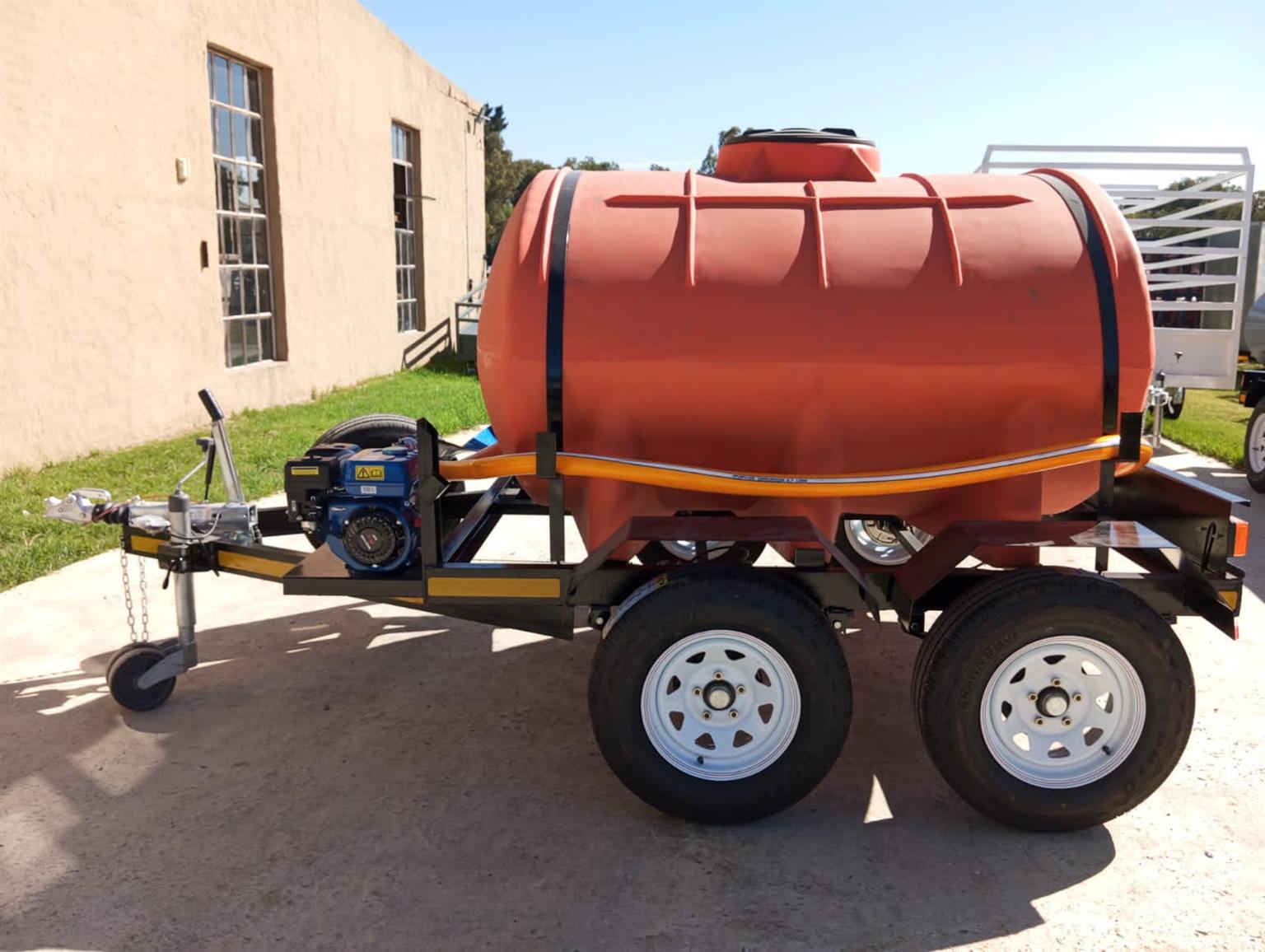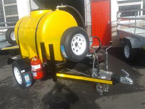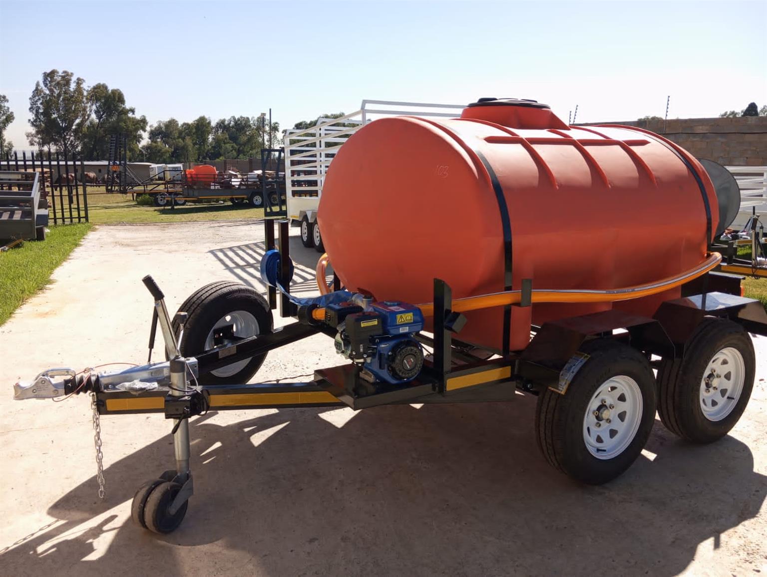 2500 liter polyurethane bowser chassis made from 100x50 heavy duty u channel poly urethane double layer 10mm tank 45 mm square axel 1500 kgs carrying capacity braked 2 axel 14 inch tires 60 mm round Dubbel Jockey wheel 3 ton braked cast iron galvanized coupler with damper combo set 4 in one halogen light , brake , park , flickers and license disc light 7 pin trailer plug combo set 4 in one halogen light , brake , park , flickers and license disc light 7 pin trailer plug red 50 mm reflectors on front of mud guard , white 50 mm reflectors on rear of mudguard , mudguards not for standing on standard 1150 mm stick on chevron board on rear with a pump and a 14" spare wheel.