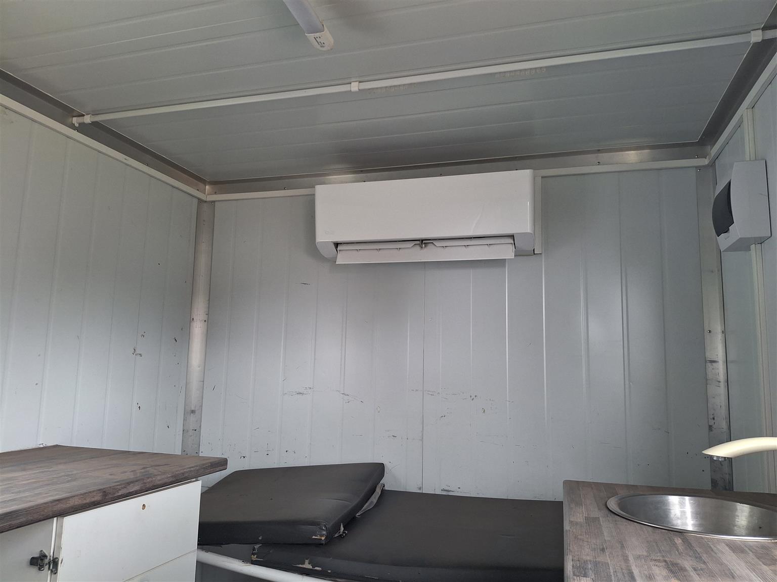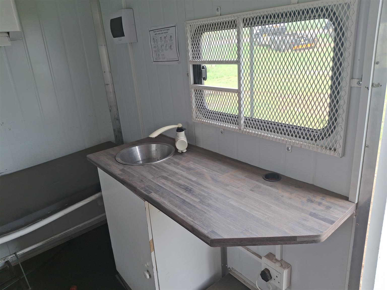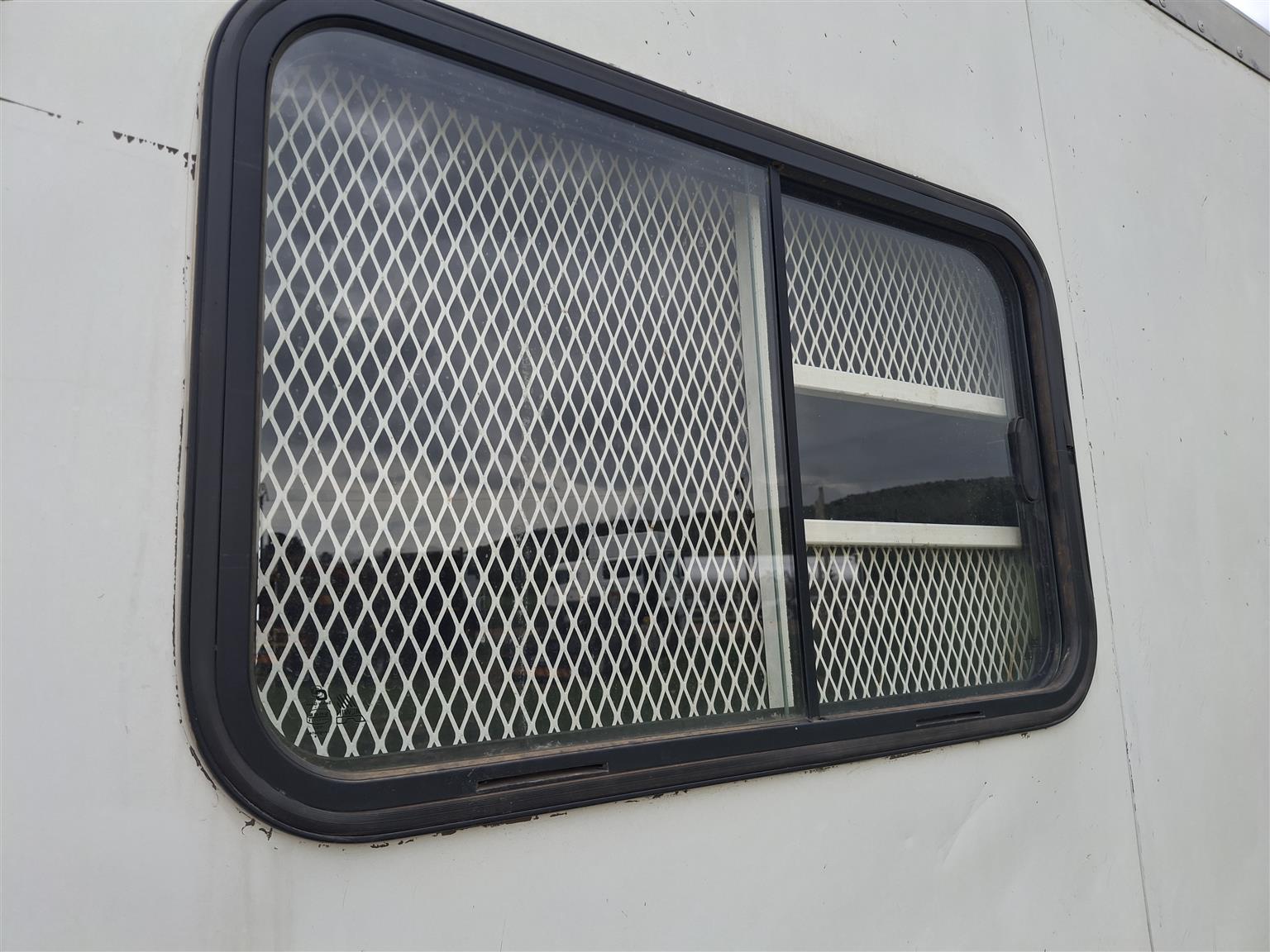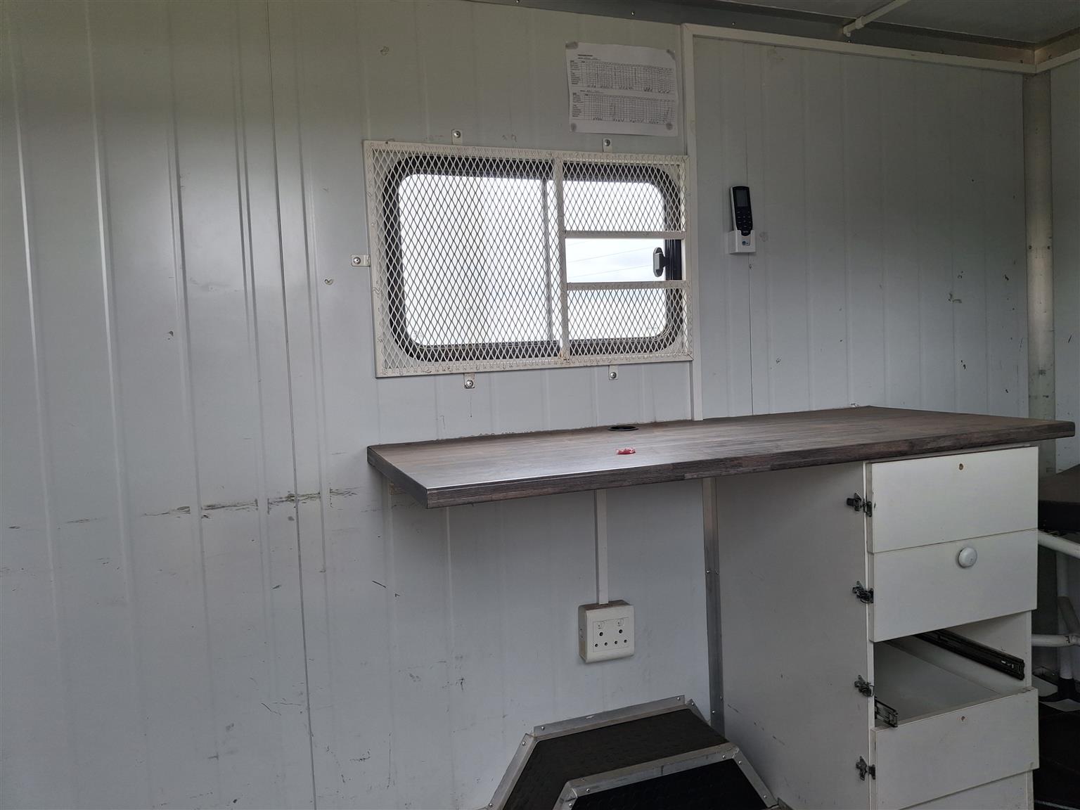 Unit has air con, full insulated with fibre glass, toilet,bed, plugs for power, fridge, lights, windows with security covers over them.