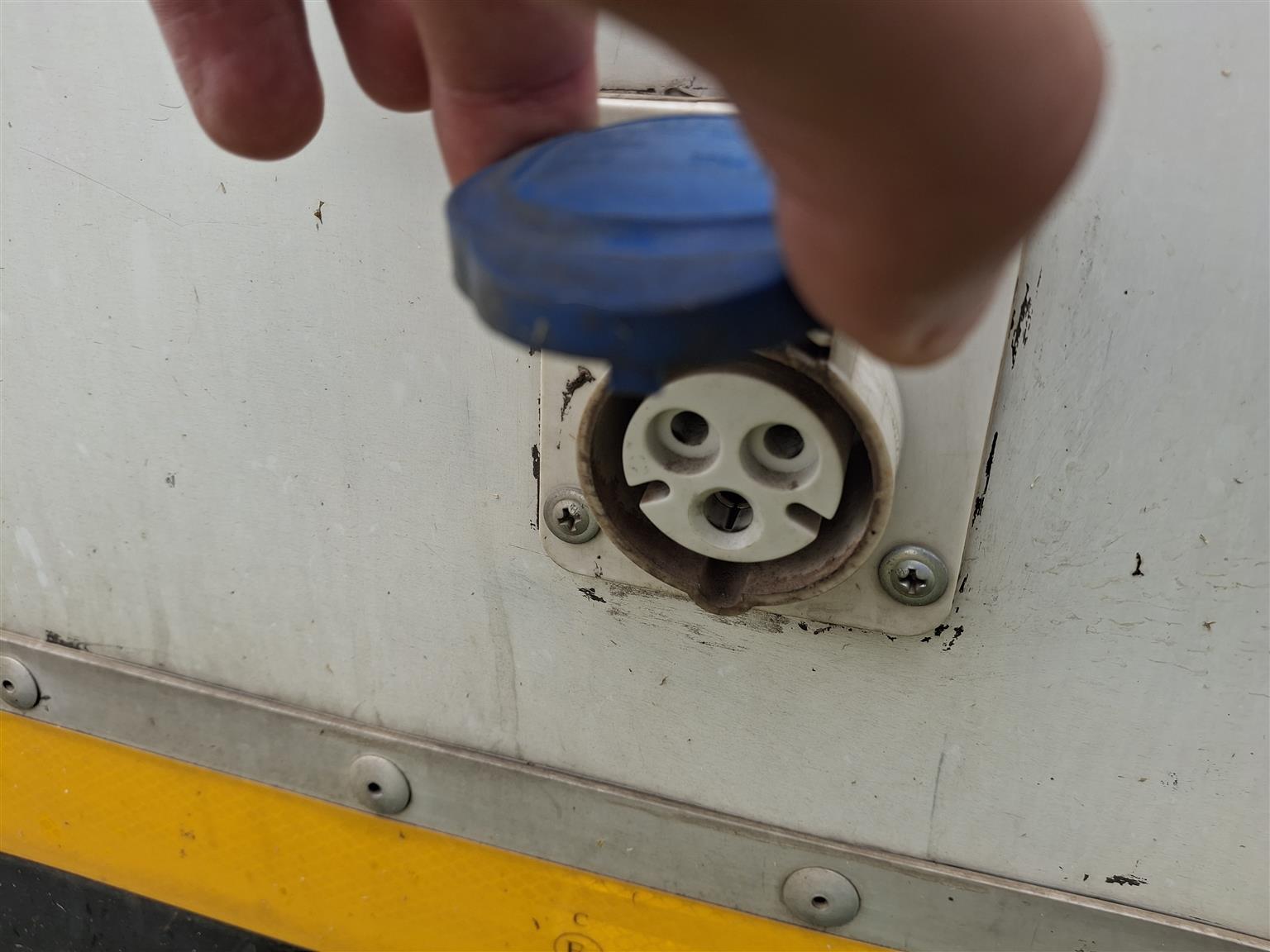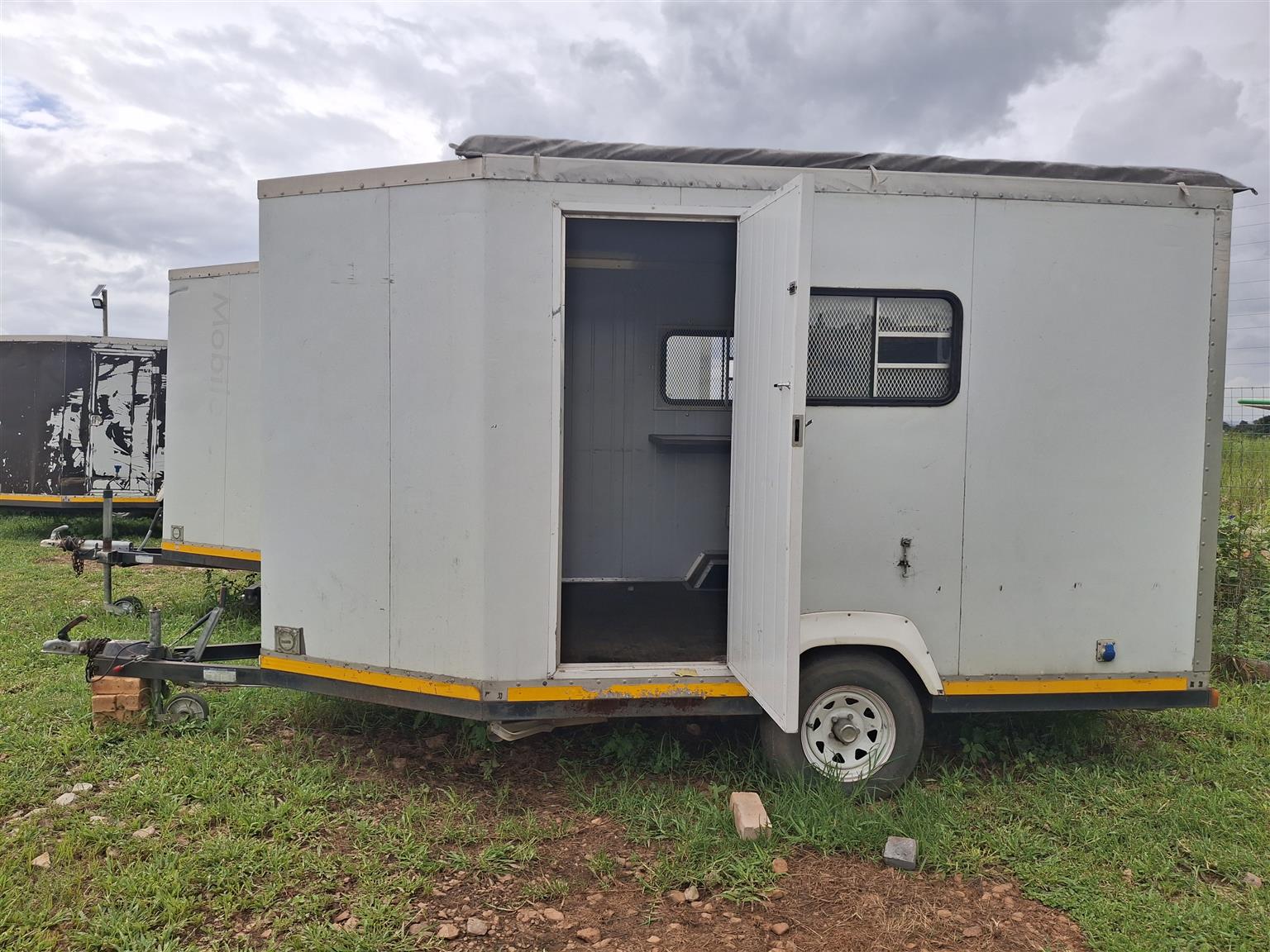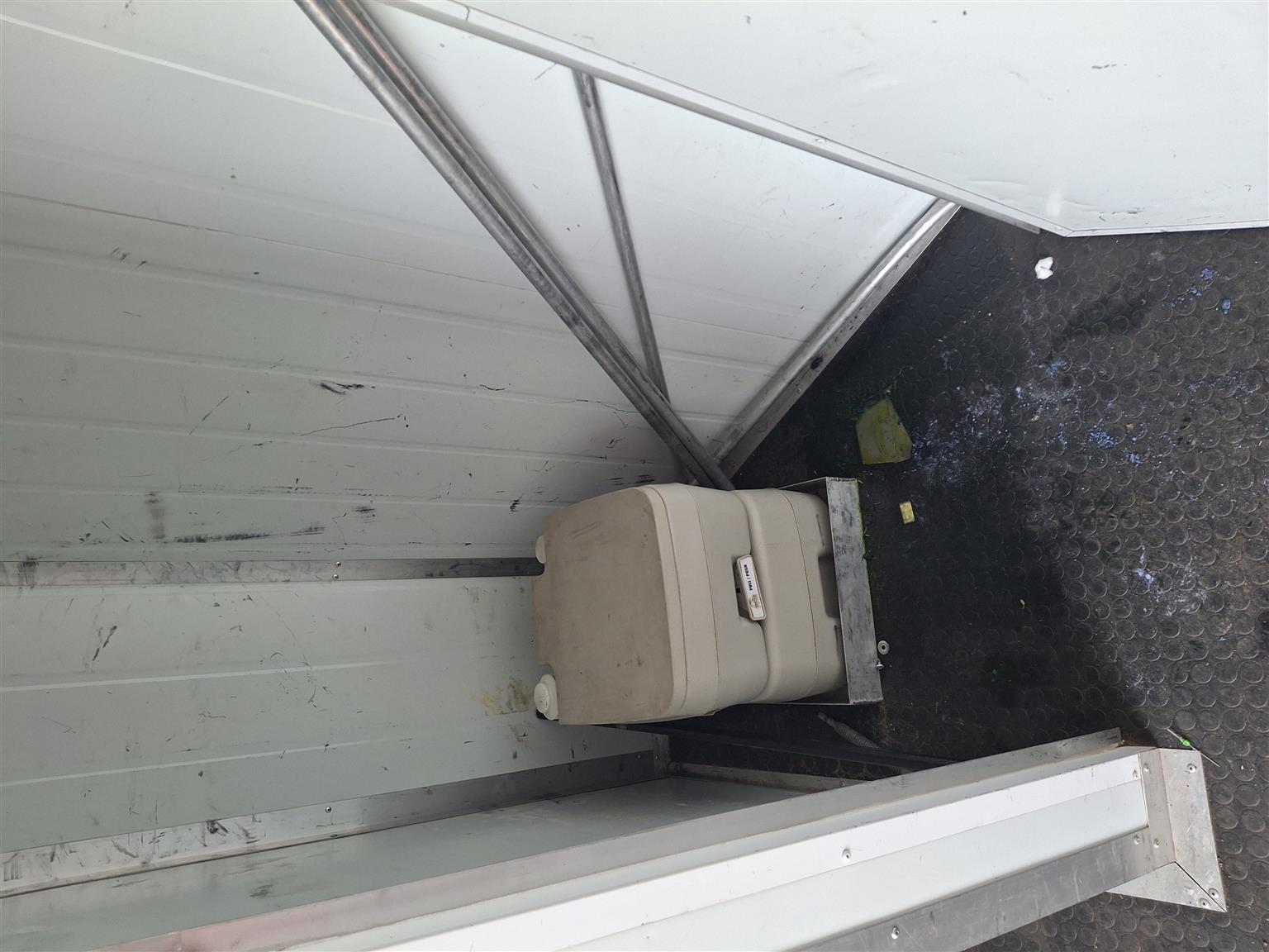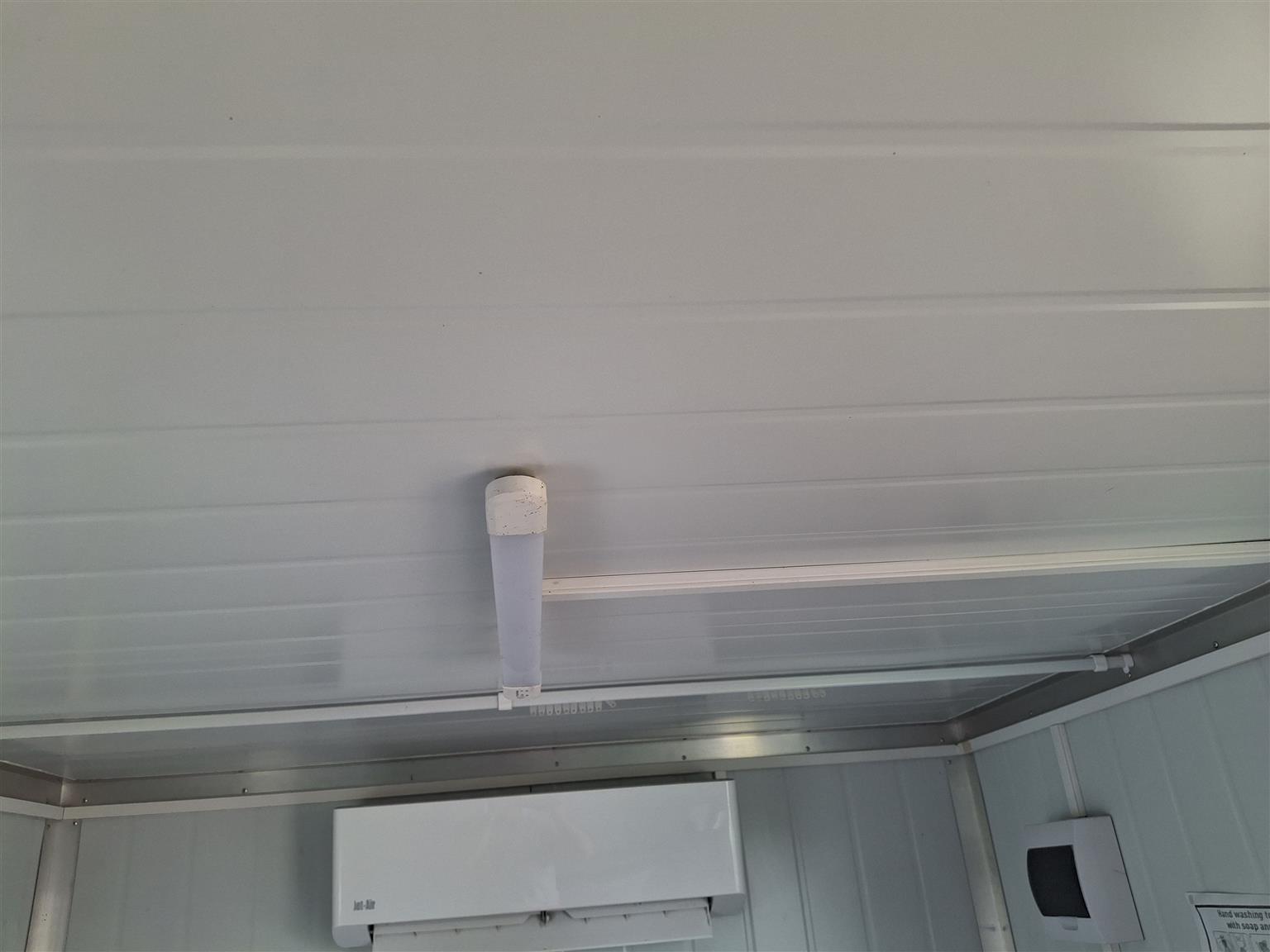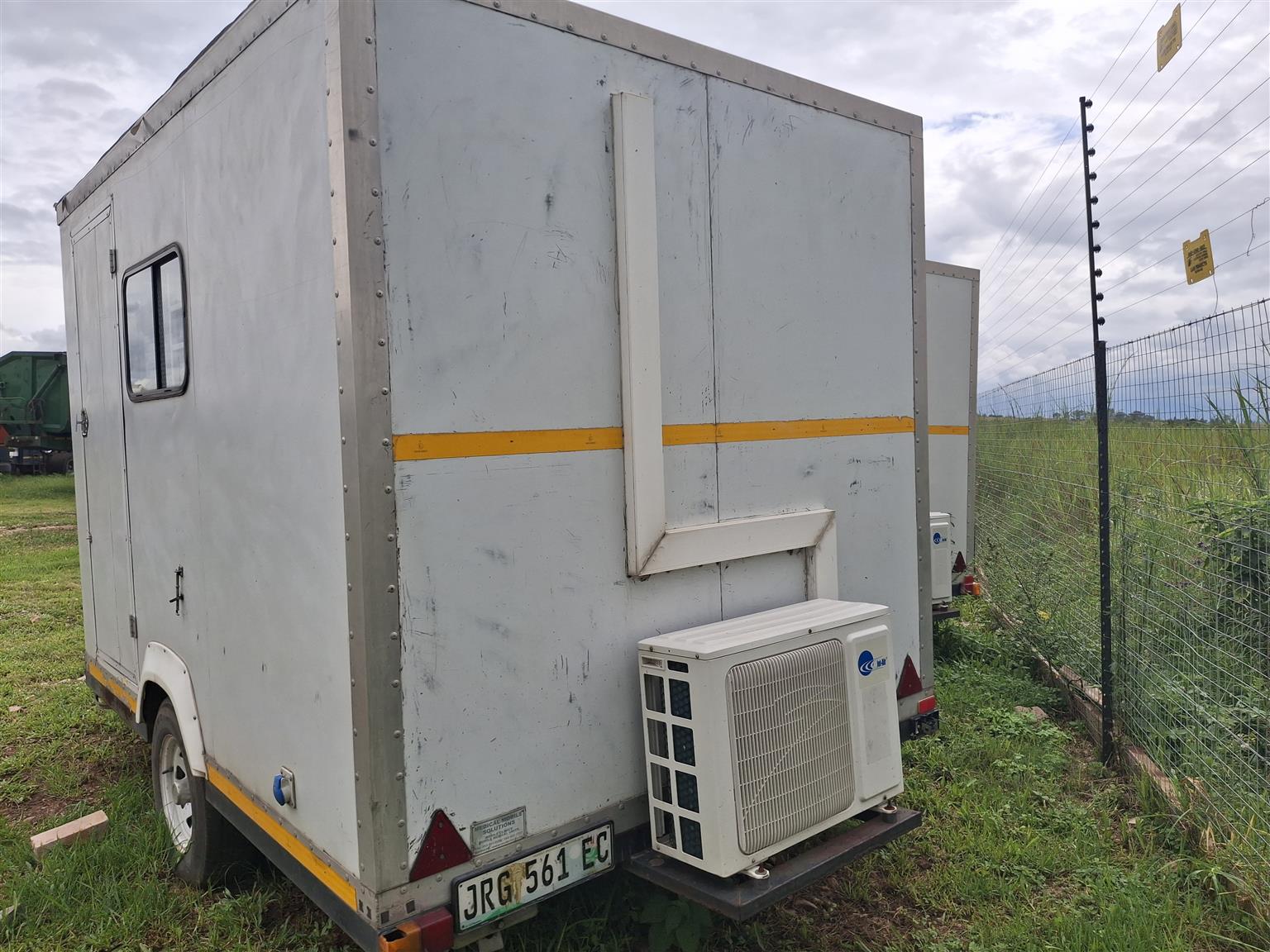 Unit has air con, full insulated with fibre glass, toilet,bed, plugs for power, fridge, lights, windows with security covers over them.